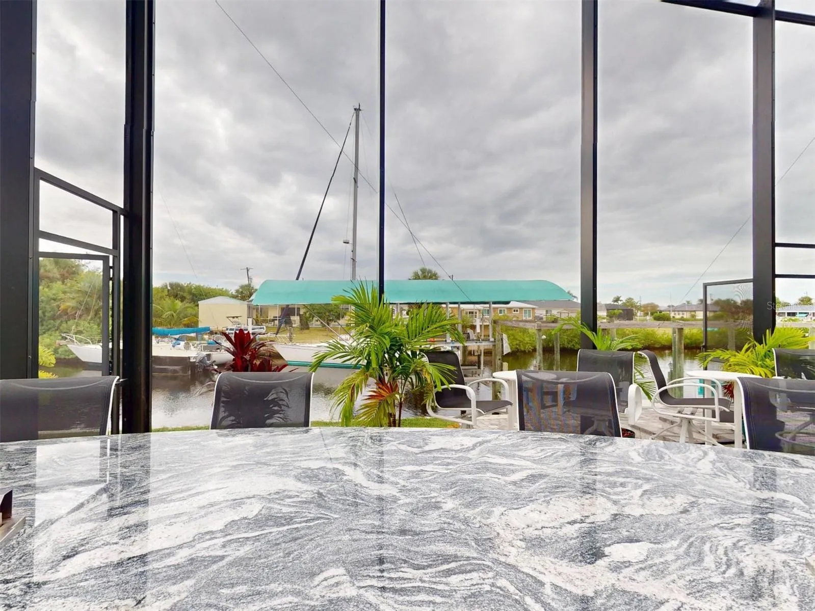 Beyond the pool, the 58×18 brick-paver patio leads to the 160-ft concrete seawall, 30-ft dock with shade sails, electric and water hookup, fish cleaning station, and a covered 10,000-lb boat lift— everything you need for the ultimate boating lifestyle.