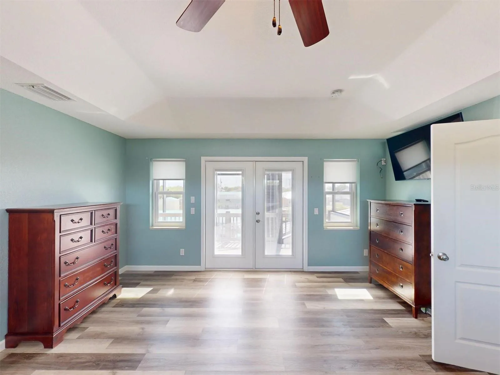 Downstairs, you’ll find two guest bedrooms, each with walk-in closets; the third bedroom offers French doors leading to the waterfront patio, perfect for morning coffee or sunset views.