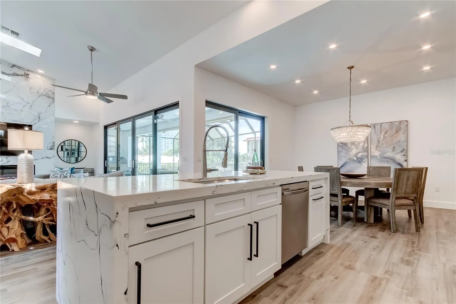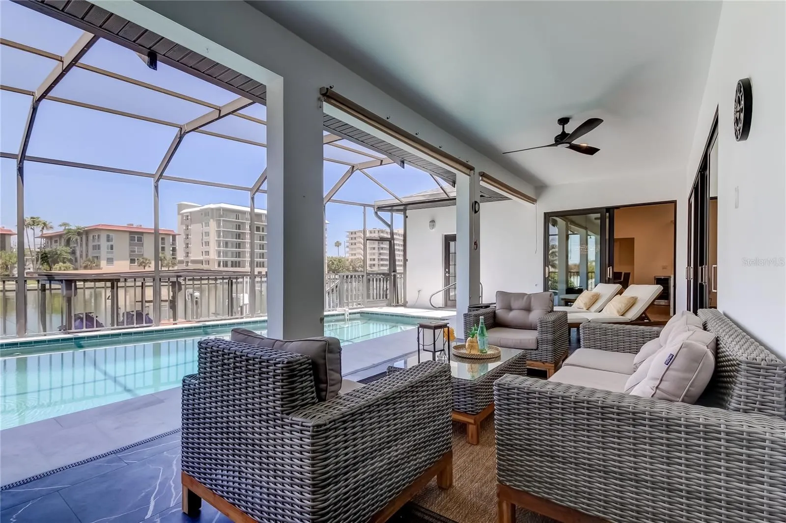Located in the highly desirable Island Estates neighborhood of Clearwater Beach, this STUNNING WATERFRONT single family 4 Bedroom , 3 Bath residence at 112 Leeward Island offers coastal living at its finest. This spacious home spans almost 3000 square feet on one level and is situated on a generous size elevated lot and positioned on a protected canal providing access to the expansive waterways of Clearwater Beach. A perfect blend of luxury living and a waterfront lifestyle. Beautiful lush tropical lanscaping and a grand entrance featuring soaring 14 foot high ceilings and a array of amazing natural light beaming through from sunrise to sunset . Gorgeous NEW custom kitchen with new cabinetry, fabulous quartz countertops, new stainless appliances , wine refrigerator and a huge island with ample seating. There are 2 seperate dining areas with plenty of room for family and friends. An inviting living room with a modern fireplace wall featuring a new LED fireplace. Indulge in your private Primary suite and master bathroom with beautiful finishes including a dual walk in shower, dual sink vanity , his and her walk in closets and a opulent soaking tub. Designed with comfort and privacy in mind this home features a split floor plan that thoughtfully separates the primary suite from the additional 3 spacious bedrooms located on the other side of the home. Convenient inside laundry room with utility sink and cabinet storage. The heart of this home overlooks your private enclosed saltwater heated pool and spa thats sits high above the Intracoastal Waterway. Rare oversized 2 car garage with 26 foot high ceilings, plenty of room for a golf cart and a additional 3000 square feet of storage in the crawlspace. New Roof (2022), New Hurricane impact sliding doors (2022), new pool heater , new interior and exterior paint and NO Flood damage to the interior of this home! Experience the best of outdoor living in your private coastal retreat where the pool area delivers both style and serenity with western exposure , amazing sunsets , tranquility and ocean breezes. Great boating set up that includes a composite dock , a dual jet ski lift, electric/ water supply and boat lift that can accomodate a larger vessel. Located minutes from the grocery store, shopping, fine dining, Clearwater Beach Aquarium, local attractions, the NEW Imagine Clearwater Waterfront Amphitheater and the most amazing clear waters, sugar sand beaches and sunsets! This impressive home has it all ! Come live the life of luxury in this exceptional waterfront home ! Don’t miss out on this one ! Book your private showing today !