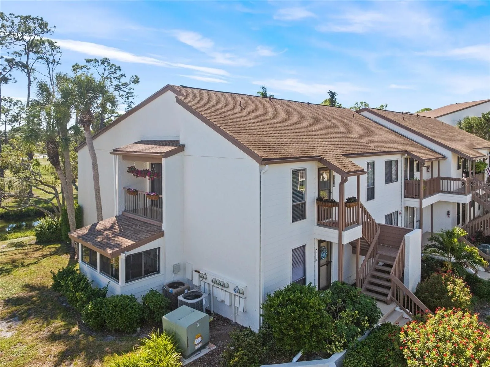 Welcome to this bright and freshly painted second-floor corner unit in Bird Bay Village. This spacious condo features an open floor plan with vaulted ceilings, two lanais, and peaceful pond and fountain views. Luxury vinyl plank flooring runs through the living room, dining area, kitchen, guest bath, and hallway for a clean and cohesive look. The kitchen offers quartz countertops, modern appliances, and a convenient pass-through to the dining area.
