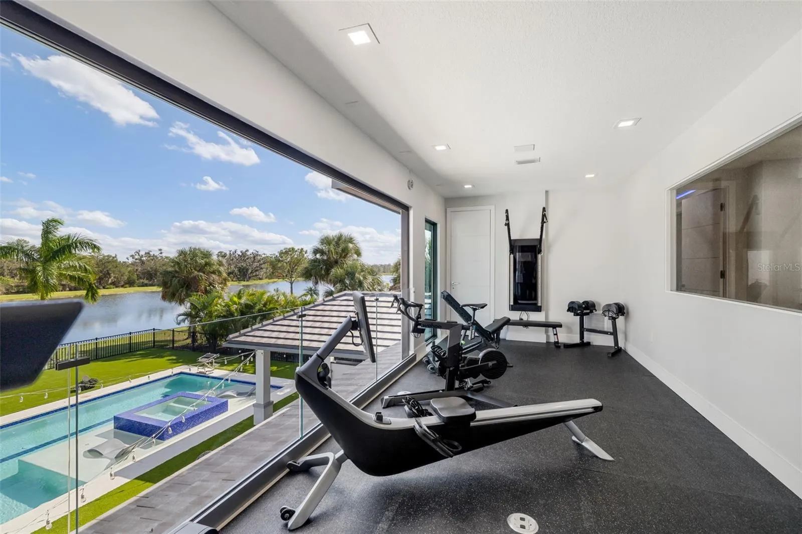 A dramatic glass-and-wood floating staircase and feature wine wall set the tone for the sleek interior, where soaring ceilings, designer lighting, and expansive glass showcase peaceful lake and preserve views. The gourmet kitchen features an oversized waterfall island, Wolf appliances, 2 dishwashers, custom cabinetry, and a fully equipped butler’s pantry with Miele coffee station. Flexible living includes two private offices, a home gym, and a dedicated theater.