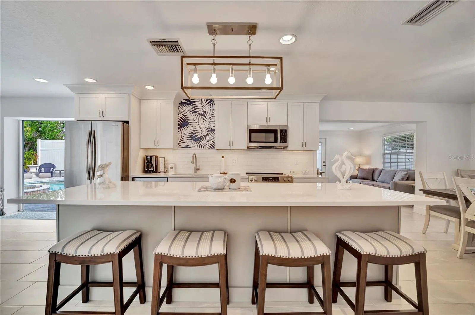 Under the canopy of grand oaks and banyan trees, this move-in-ready FURNISHED Siesta Key POOL home offers the perfect blend of luxury and coastal charm. Located minutes from the world-famous beach and village, this retreat has been redesigned for island living with almost every inch of the home renovated to perfection! A freshly painted exterior, paver driveway, and xeriscape landscaping create a warm welcome. Inside, an open floor plan creates effortless indoor-outdoor living with tile flooring, bright living area, and pocket sliding glass doors seamlessly connecting to your private backyard oasis. The expansive paradise features a sparkling pool and hot tub with new pump/heater, surrounded by new privacy fencing, and an extended paver patio. The heart of the home is the renovated chef’s kitchen, boasting duo-toned soft-close cabinetry, quartz countertops, and tile backsplash. The oversized kitchen island and adjacent dining area set the stage for lively gatherings, while the cozy den opens up to the patio for effortless pool-side alfresco dining. The primary suite features direct pool access and a newly updated bathroom with soaking tub, walk-in shower, and modern finishes. Thoughtfully designed for privacy, the split floor plan includes a poolside guest room along with two additional bedrooms tucked in a private wing with an updated bathroom. Additional updates include a NEW AC system/ductwork and NEW Hot Water Heater ensuring year-round comfort. The oversized two car garage offers plenty of parking and extra space for a golf cart and beach gear. Enjoy the tranquility of the tree lined streets while still having easy access on and off the island. This home is being enjoyed by seasonal renters, but now it’s your turn to enjoy island life! Whether you’re looking for a lucrative FURNISHED short-term rental, a seasonal retreat, or a forever home, this renovated Siesta Key gem offers the best of island living!