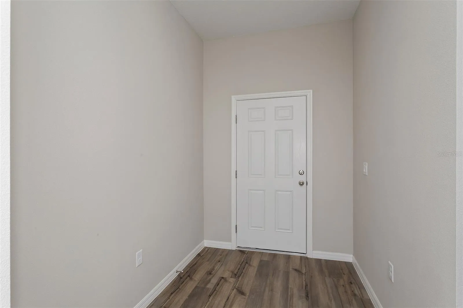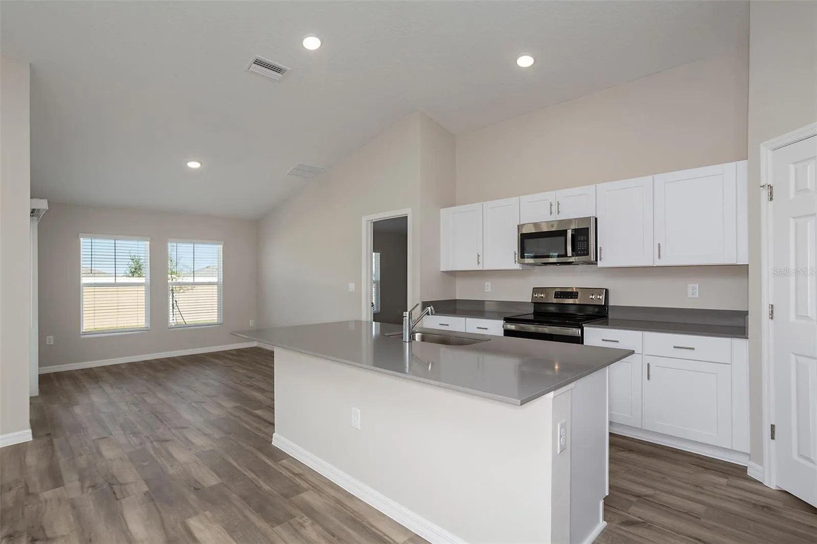 Under Construction. Discover a world of effortless elegance and comfort with the Valeria, a single-story home featuring 4 bedrooms, 2 bathrooms and a 2-car garage. The foyer leads to three bedrooms, a full bathroom, and a convenient laundry room with washer and dryer included. The vaulted-ceilings and open concept living, dining, and kitchen areas are perfect for entertaining or cozy family nights, all enhanced by sleek quartz countertops, stainless steel appliances and luxury vinyl plank flooring. Enjoy seamless indoor-outdoor living with access to the covered lanai through sliding glass doors in the dining area. The owner’s suite is spacious and can easily fit a large bedroom set, the owner’s bathroom is impressive with a dual vanity, walk-in shower and an oversized walk-in closet. The smart thermostat with voice control and charming landscaping add to the home’s appeal and practicality.