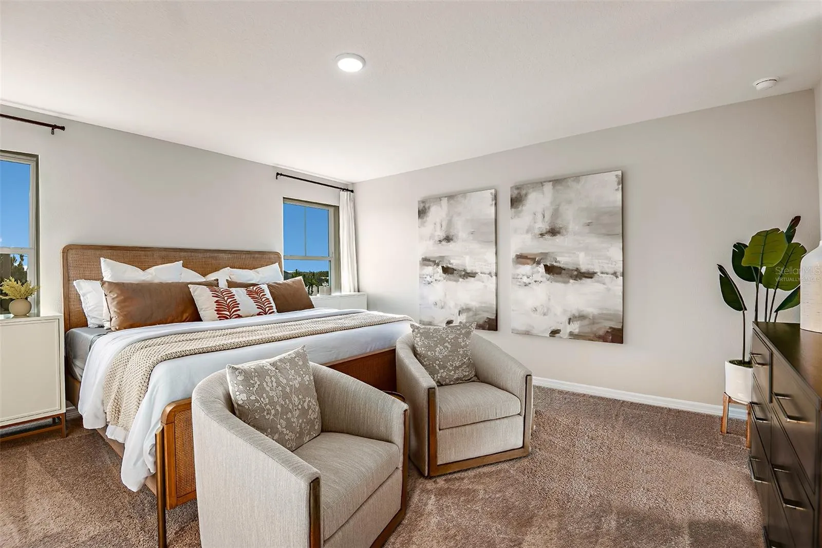 One or more photo(s) has been virtually staged. Under Construction. BELOW MARKET INTEREST RATES with use of Seller’s Preferred Lender. Invite yourself into the Lucia, a two-story home with 5 bedrooms, 3 bathrooms and a private 2-car garage. Just off the foyer, you’ll find a welcoming guest suite complete with a private bathroom, offering the perfect blend of comfort and privacy. The open concept living area, highlighted by luxury vinyl plank flooring, flows seamlessly into the kitchen, which features sleek quartz countertops, stainless-steel appliances and a spacious pantry. Sliding glass doors lead to a charming patio, ideal for outdoor relaxation in the Florida climate. Upstairs, the flexible recreation space and stylish master suite—with its walk-in shower, dual vanity and oversized walk-in closet—provide a serene oasis. The 3 additional bedrooms, full bathroom and laundry room equipped with brand new washer and dryer make everyday life convenient. With a smart thermostat with voice control, beautiful landscaping, and an eye-catching elevation, this home ensures both style and practicality.