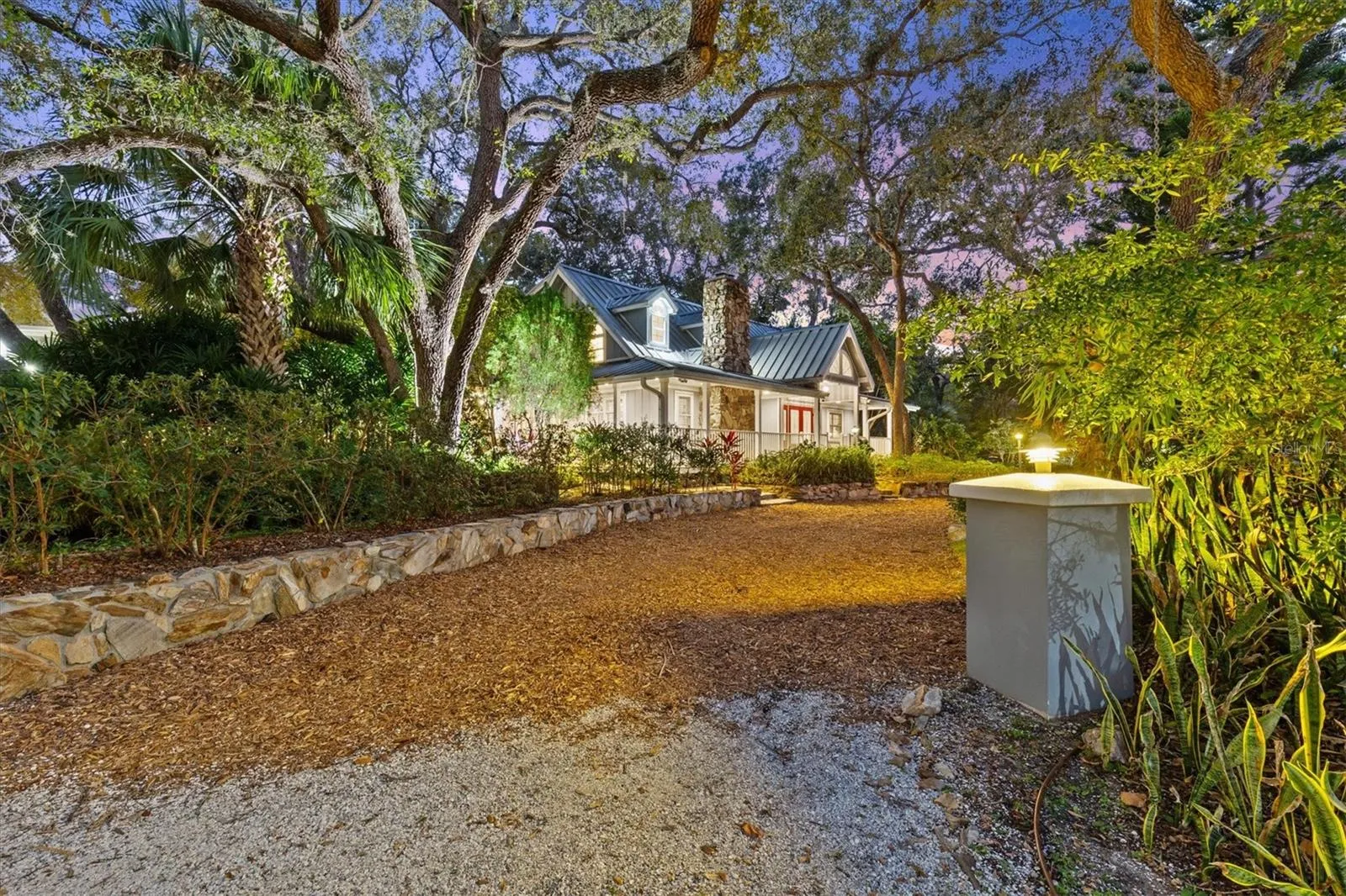 stunning metal roof, dormer windows, flourishing landscaping, and majestic oak trees.