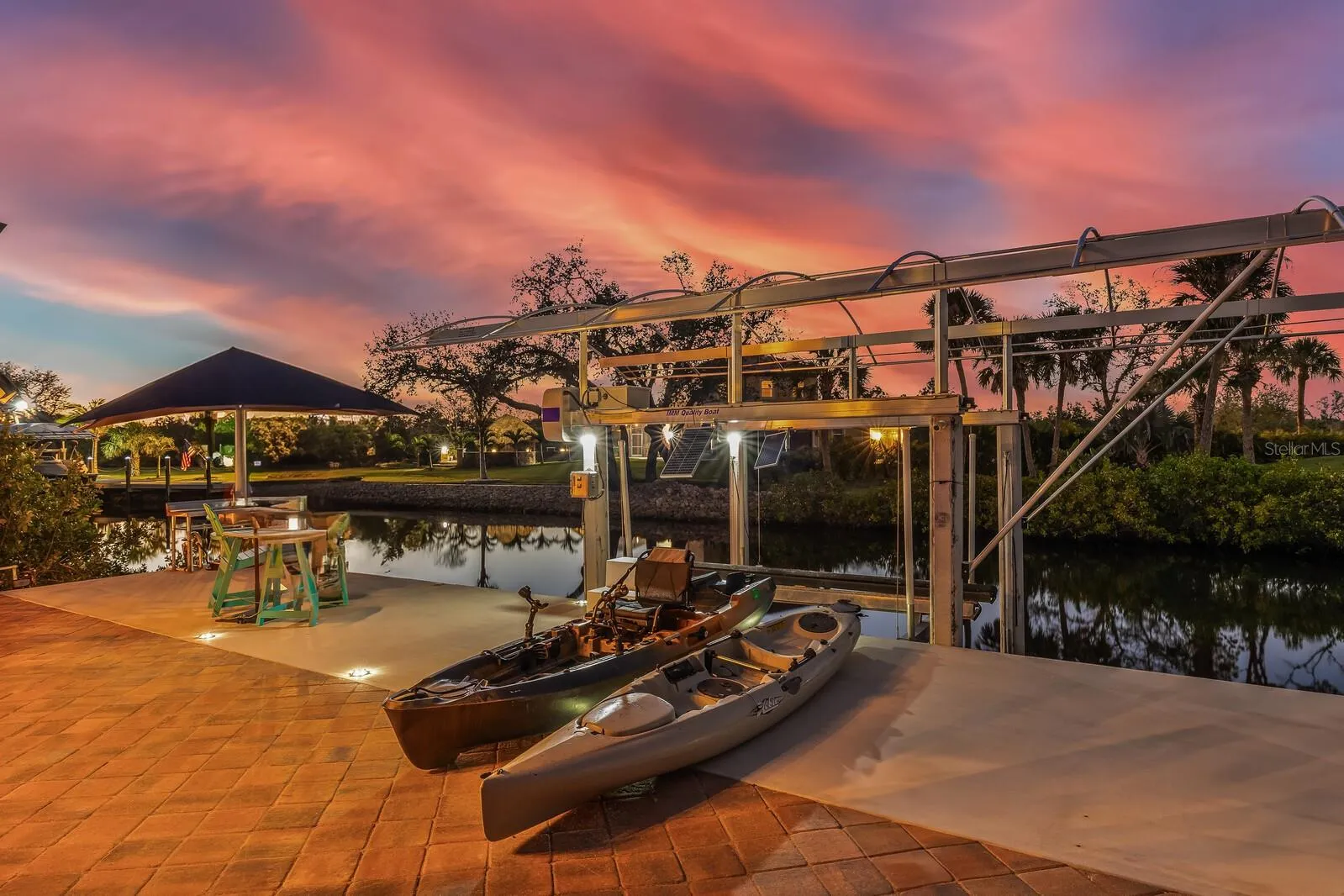 The three-car garage with epoxy floors offers space for luxury vehicles, golf carts, and boating gear. Beyond the screened lanai, the private dock with lifts gives direct access to exceptional boating and fishing — a true waterfront enthusiast’s dream.