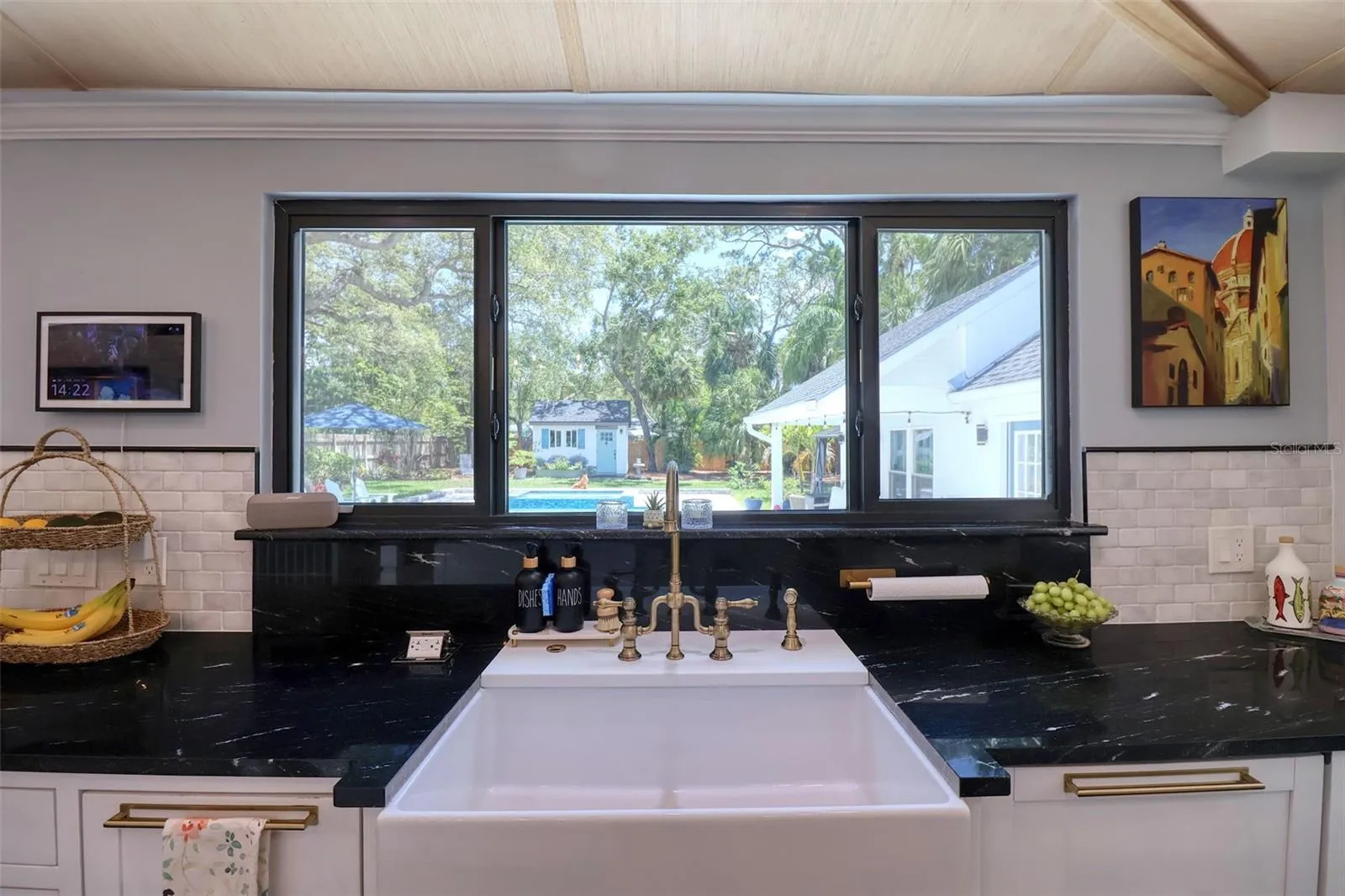 Elegant and sophisticated aptly describes this pristine 1927 Historic Landmark pool home with a Carriage House situated on over a 1/4 acre lot in the highly sought after Downtown Dunedin golf cart friendly Fenway-on-the-Bay neighborhood. This stylish home is for the discerning buyer with every attention to detail being addressed. Built in the same era, and within walking distance of the iconic Fenway Hotel, this home has been meticulously renovated with high-end modern luxuries while retaining its era charm. This delightful home is light and bright. The main home boasts a welcoming living room with gas fireplace, dining room, family room, and a large renovated kitchen with striking granite countertops, a huge kitchen island, farm sink, wood shaker cabinetry, high-end commercial Wolf & Subzero stainless-steel appliances, and a 100+ bottle wine cooler. Off of the kitchen is a charming Butler’s pantry with copper sink, vintage window, built-in shelving and more spacious cabinetry. Open to the kitchen enjoy the family room, featuring its original refinished oak floor and unique raised ceilings and unparalleled view of the pool and backyard. The primary bedroom is spacious and bright and offers a built-in closet plus modern extra tall cabinet storage space. The second bedroom is currently being used as an office and it too offers a built-in closet. The pristine primary bathroom has a frameless glass shower surround, vintage-look vanity, lighted mirror, modern tiled floor, and a Vela Plus Self-Cleaning Smart Toilet/Bidet. Off of the dining room is an intimate bespoke cocktail lounge with lighted built ins, mirrored shelving and deep storage cabinets, which could be transformed into an office. The home boasts wide wood plank and distinctive tile flooring, a neutral color palette, unique lighting fixtures, ample storage, all culminating into a truly historic feel with modern, luxurious updates. The fenced backyard is lush, private and offers a view of St Joseph’s Sound, multiple seating areas, and a tranquil 15×30 natural gas heated pool and spill over 8-person spa. There is a cabana with electrical wiring and windows, currently used as a work shed. The light and bright Carriage House is separate from the main home and shares similar high-end finishes, with its tall ceilings, large tiled bathroom, a kitchenette, and spacious, sunny living area and a bedroom with high ceilings. It is heated and cooled by a 2 head mini-split, and offers a beachy vibe with ceiling fans, painted wood flooring, and shiplap wall accents. This stunningly beautiful home is move-in ready and offers many notable efficient & structural features including LOW-E impact windows, whole house Generac generator, encapsulated crawl space, and a UV air purification system. With a home of this vintage, it is refreshing to see the renovations and updates have been permitted through the City of Dunedin. Watch the attached VIDEO to fully appreciate this home. The location is also first class; walk or jump in your golf cart to nearby shops and restaurants; the Pinellas Trail intersects the street and is just a stroll away. Watch the sunset from your own exquisite backyard, or head downtown for dinner or to the many festivals and events. Couple this with excellent schools, pristine beaches and all that fabulous Dunedin has to offer, and you have the ultimate elegant Florida lifestyle home!