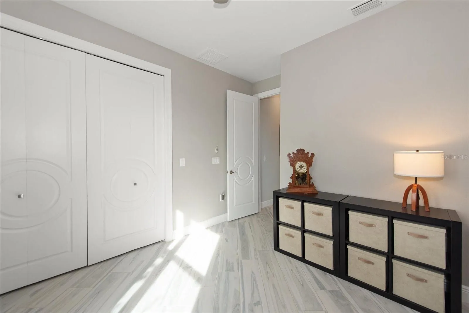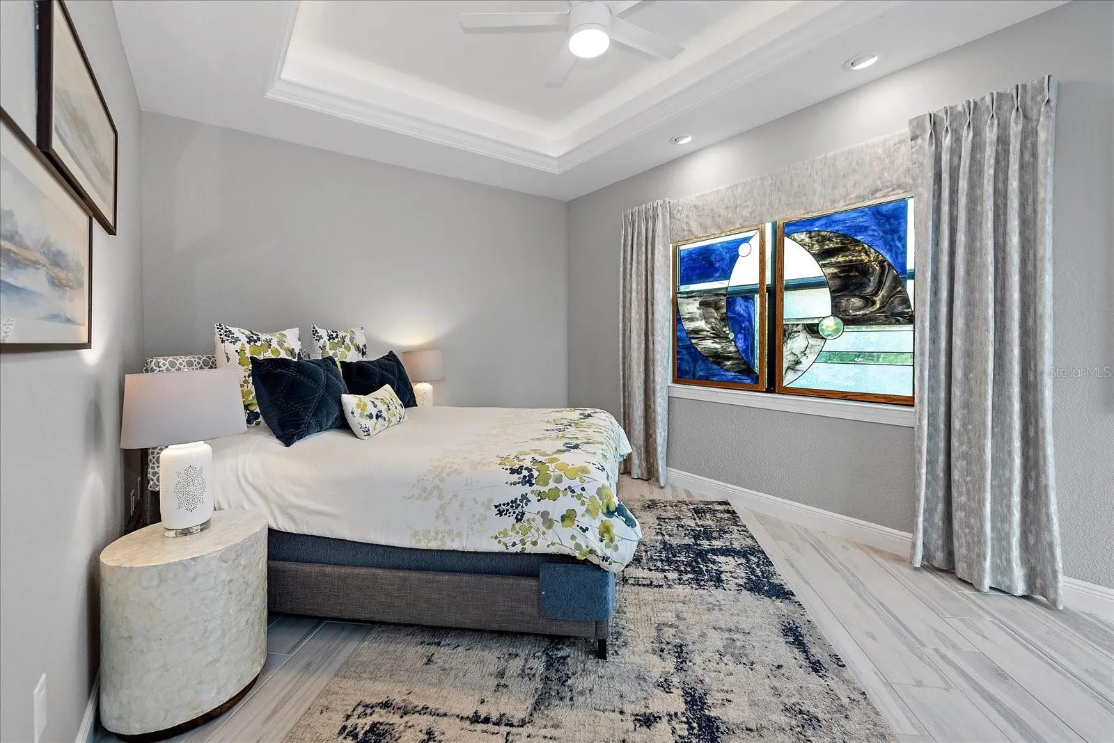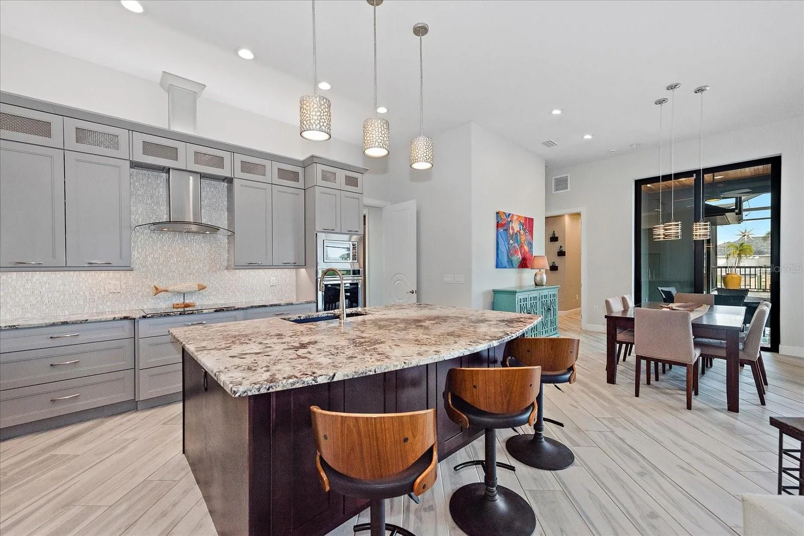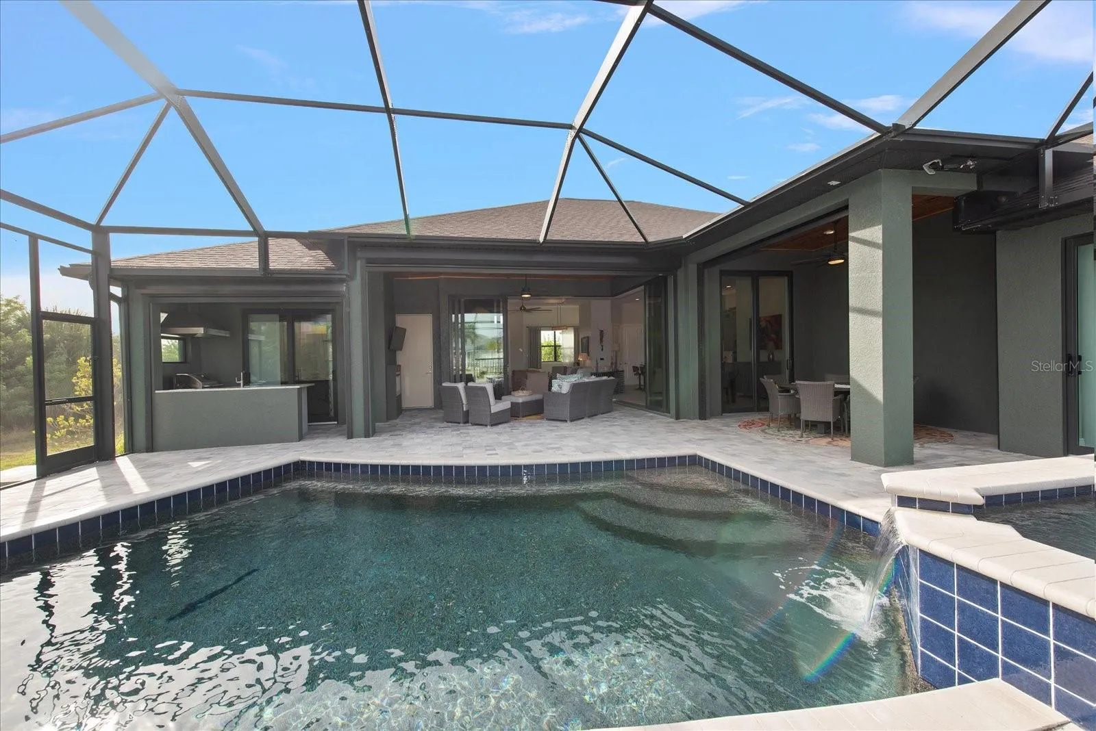 The primary suite serves as a private retreat, complete with a large walk-in closet and sliding doors that open directly to the pool and lanai. The en-suite bath features dual vanities, granite countertops, a walk-in shower, and elegant finishes that create a spa-like experience. Two additional bedrooms provide comfortable guest accommodations, while the flex room can be used as an office, den, hobby space, or fitness area.