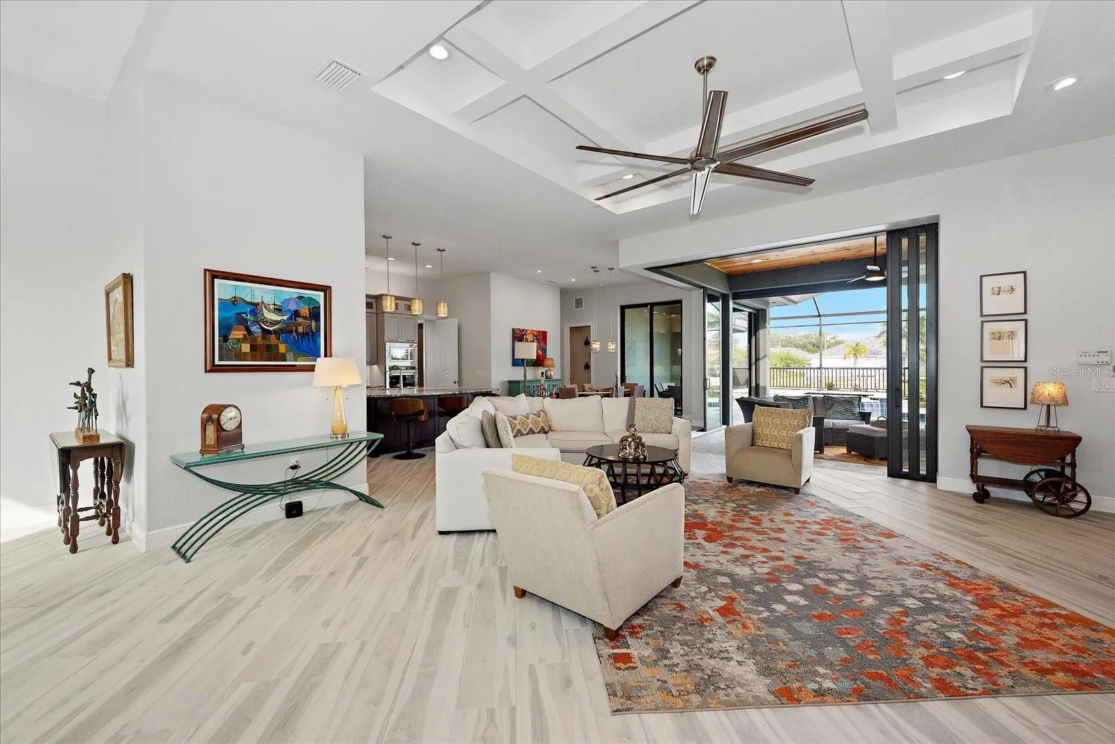 The outdoor living space truly captures the essence of Florida living. A screened lanai surrounds the heated saltwater pool and spa, providing plenty of room for relaxation and dining while overlooking the canal. The covered area offers shade for year-round enjoyment, and the open deck space is perfect for soaking up the sun. The property includes approximately 80 feet of seawall and a private dock, allowing convenient access to the Gulf of Mexico through the neighborhood’s navigable waterways.
