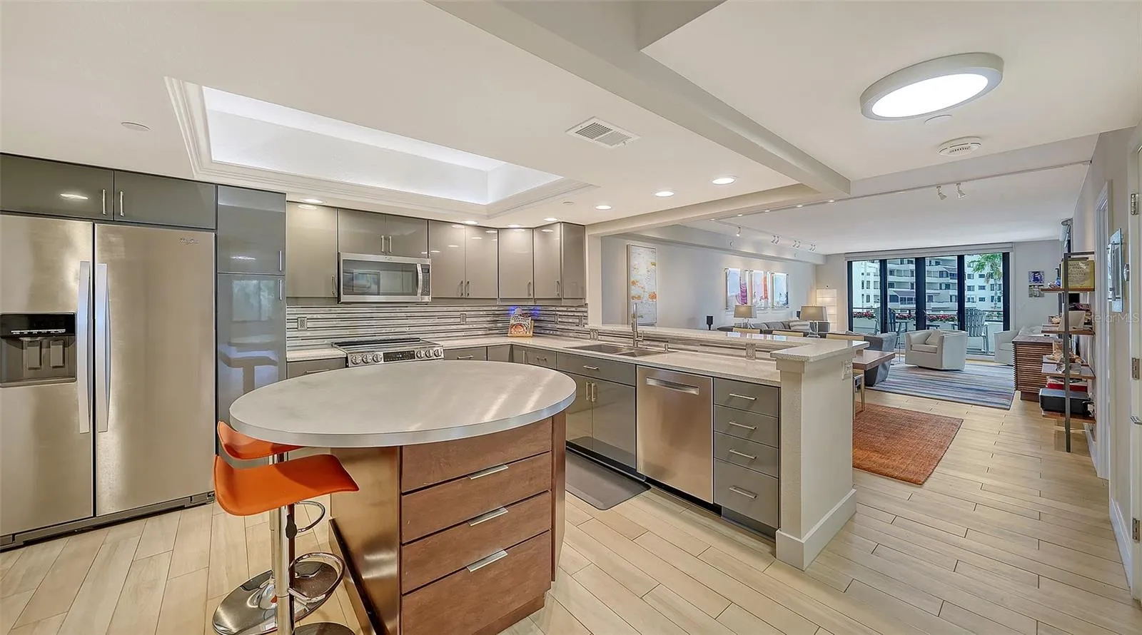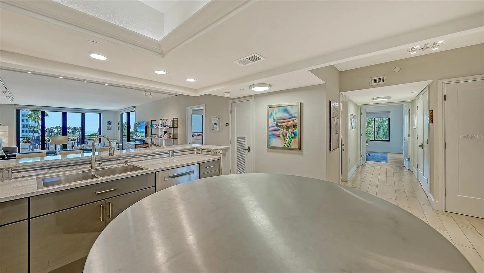 Welcome to luxury Gulf-front living at The Players Club. This sophisticated residence is a three-bedroom, three-bathroom, end-unit condominium. The great room and two primary suites each provide beautiful Gulf views and private access to the two spacious covered terraces. Its thoughtfully designed floor plan maximizes vistas and natural light across an expansive interior. The residence has undergone a comprehensive renovation, featuring a modern kitchen outfitted with custom cabinetry, quartz countertops, a center island adorned with stainless steel and espresso wood base cabinets, as well as a contemporary tile backsplash and high-end appliances. Additional upgrades include new porcelain plank flooring, freshly interior painting updated all interior doors and hardware, moldings, baseboards designer window treatments, and enhanced lighting throughout. All bathrooms have been beautifully updated with new cabinetry, countertops, tile, and premium fixtures. The great room layout with two master suites, each providing water views and private access to the extended terrace. Impact-resistant windows and sliding doors have been installed to comply with the latest building codes. For convenience, the unit includes both an assigned under-building parking space and an enclosed garage, accompanied by an external storage room. The Players Club demonstrates a commitment to excellence with recent engineering and reserve studies, ensuring ongoing community stability and maintenance. Elevator systems have been modernized and certified. The association maintains fully funded reserves for long-term reliability. Spanning 11 pristine Gulf-front acres on Longboat Key, this private community offers unparalleled amenities. Life at The Players Club is defined by luxury and leisure. Residents enjoy a newly renovated clubhouse equipped with a state-of-the-art fitness center, library and meeting room, catering kitchen, various gathering spaces, four Har-Tru tennis courts with pickleball capabilities, a 70-foot heated saltwater pool and spa, putting green, fire pits, outdoor grills, lushly landscaped grounds, deeded beach access, and the assurance of 24/7 gated security and on-site management. Players Club is ideally situated near the new St. Regis Resort, with optional membership available at The Longboat Key Club & Resort, granting privileged access to golf, dining, tennis, and the only deep-water marina on the island. Beyond the community, residents benefit from proximity to local conveniences, including Publix, CVS. and boutiques within two minutes, and the upscale shops and restaurants of renowned St. Armands Circle just five minutes away. The famed cultural amenities, many fine dining options, and shopping in downtown Sarasota is just 15 minutes from The Players Club.