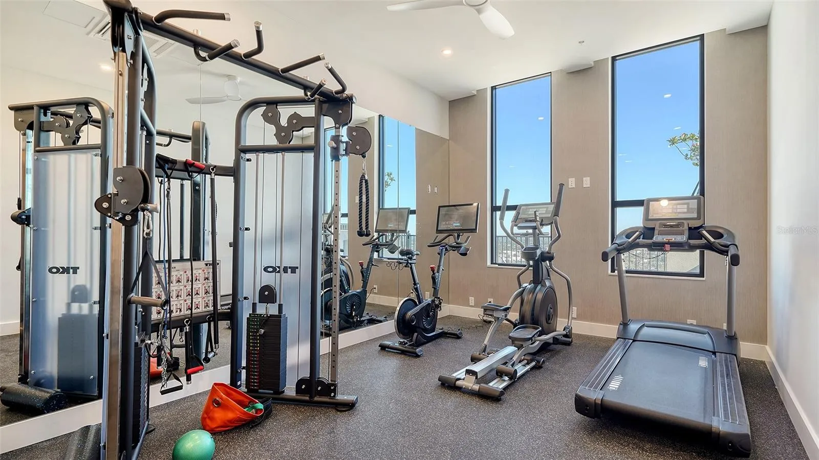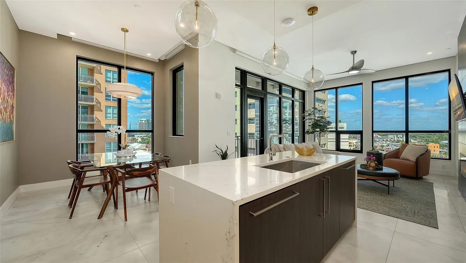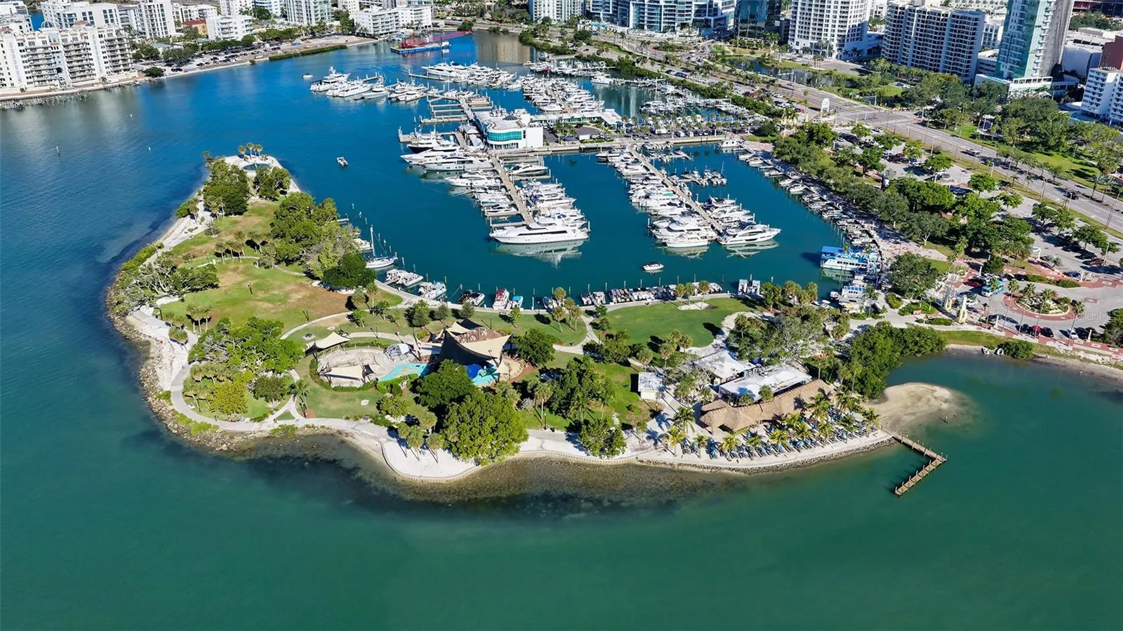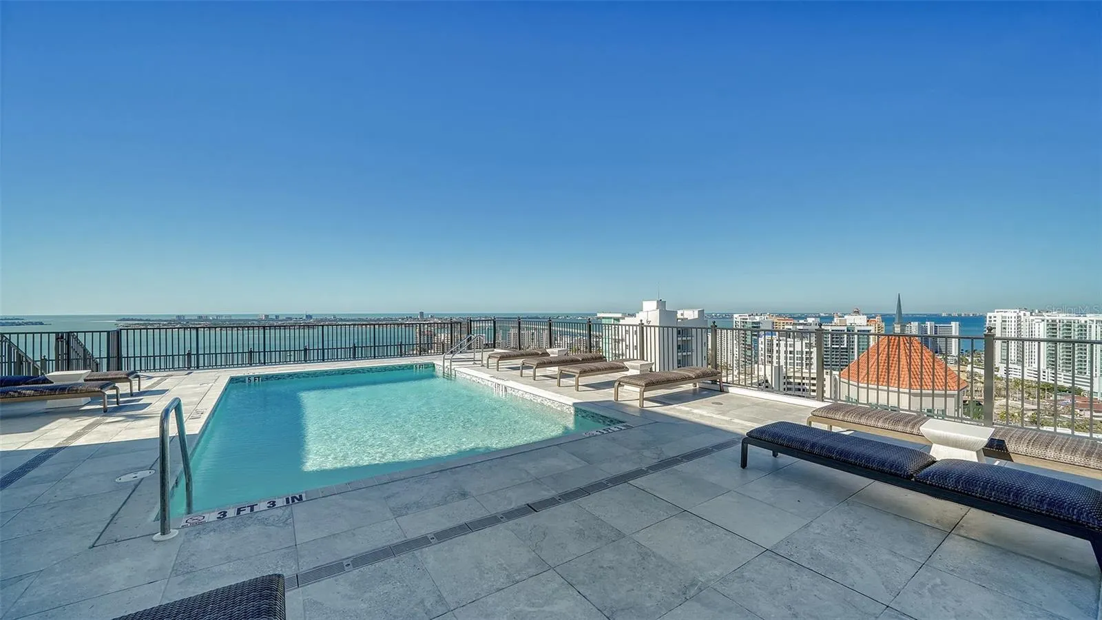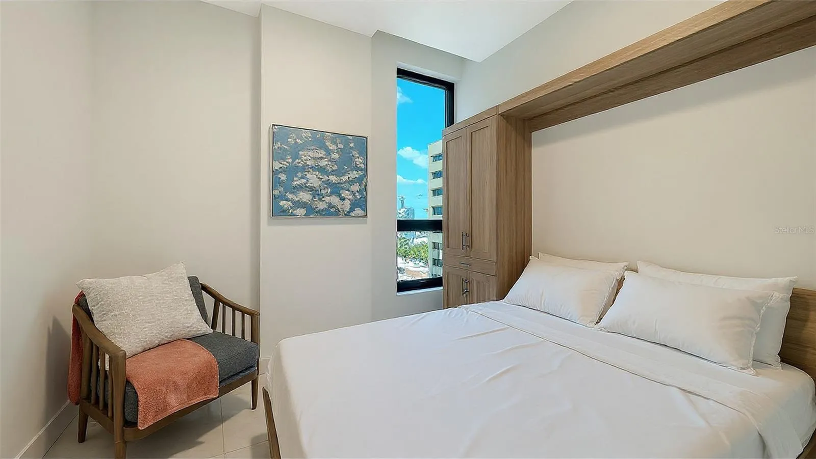 Impeccably maintained and exquisitely appointed, this corner residence embodies modern chic in Sarasota’s most sought-after downtown location. Built in 2024 and defining contemporary urban living, this impeccably maintained 2-bedroom, 2-bath, 1,337 sq. ft. home reflects curated luxury. The open floorplan showcases Italian custom cabinetry, Miele appliances with a gas cooktop, and upgraded quartz countertops with a full backsplash and waterfall island. Sleek porcelain tile flooring flows throughout, while custom lighting, designer paint, and a striking fireplace with feature wall create an ambiance of understated glamour. Both bedrooms offer custom-built closets, with a Murphy bed in the second for versatile use. Automated electric blinds and custom drapery pockets enhance the clean, contemporary aesthetic. Home is complete with a temperature-controlled storage locker and a terrace that is wired for an electric barbecue. The community features a state-of-the-art Butterfly security system. Residents of this exclusive boutique building also enjoy 24-hour staffed service and access to a spectacular rooftop amenity level, featuring an elegant club room, fitness center, and saltwater pool — all framed by sweeping views of the city skyline and Sarasota Bay. The result is a tranquil retreat above the vibrant downtown scene, offering the perfect balance of sophistication, comfort, and cosmopolitan energy.