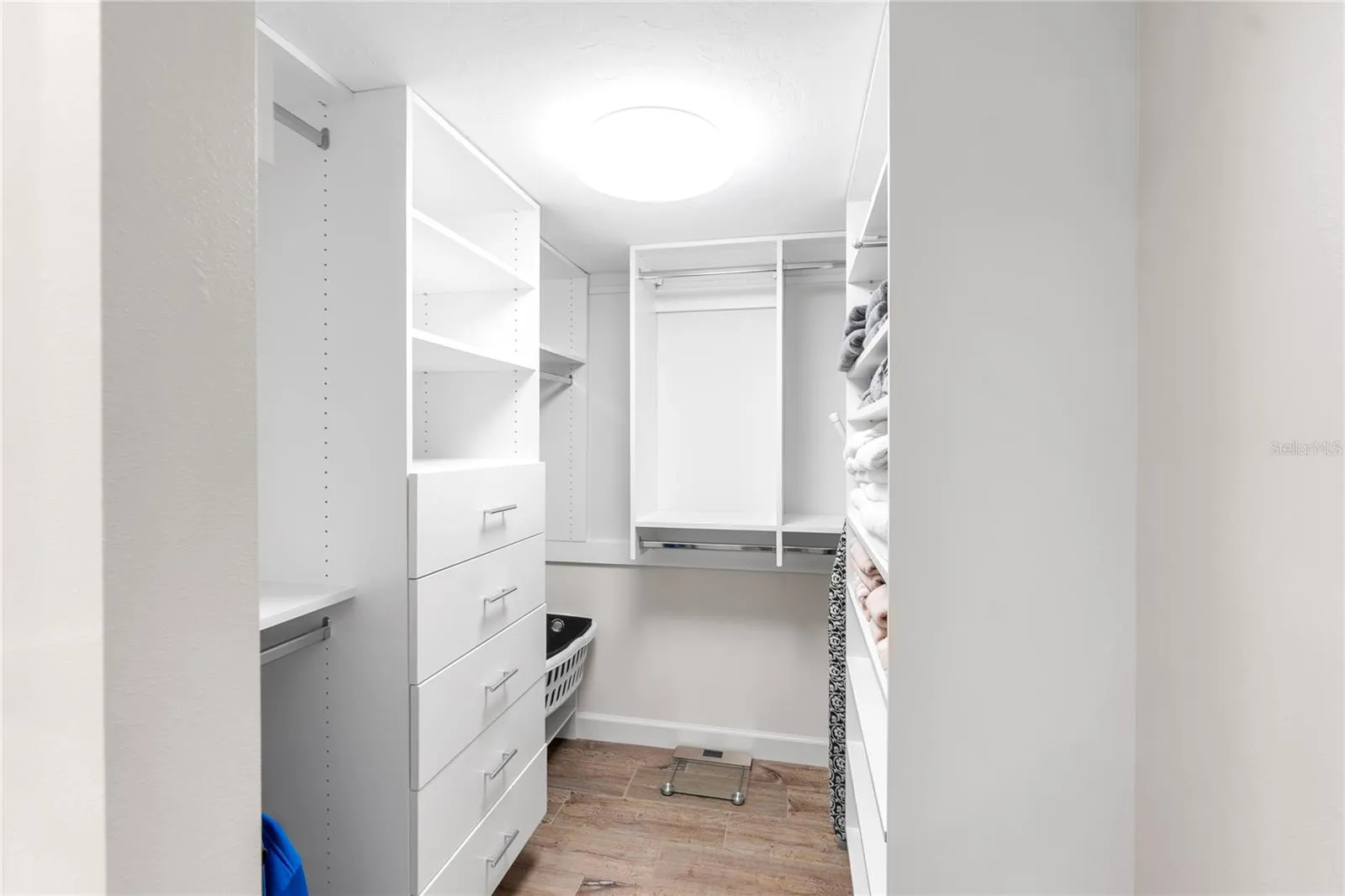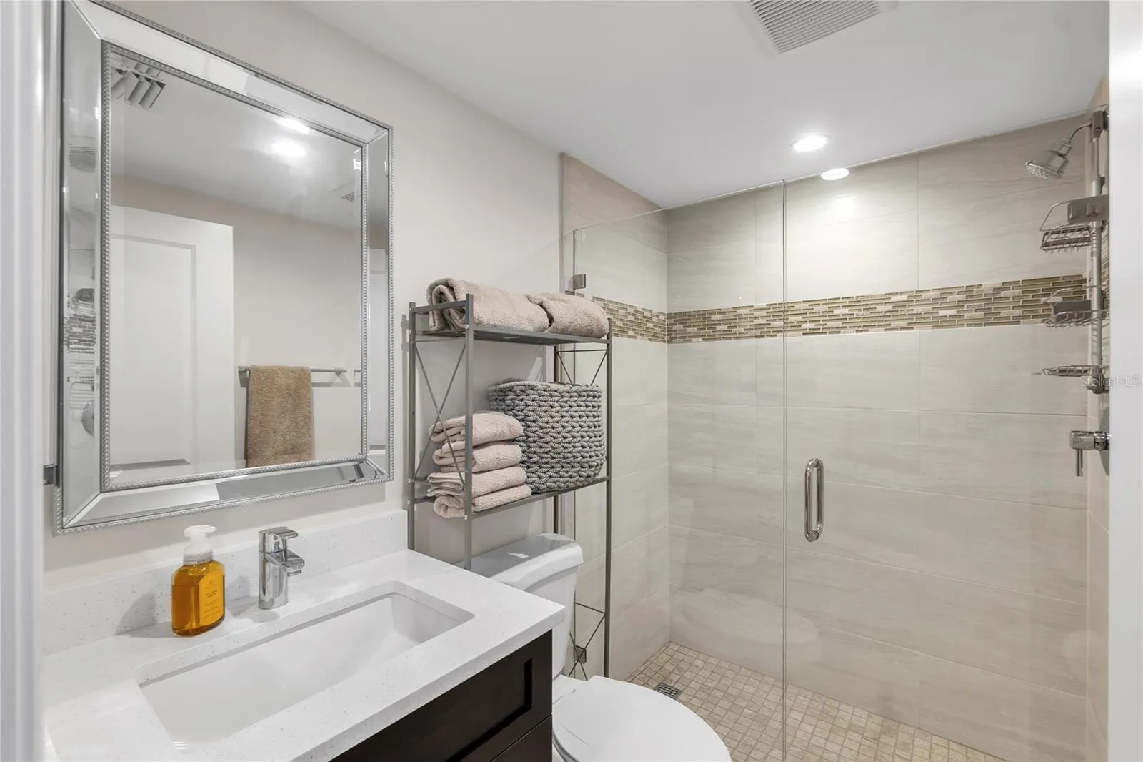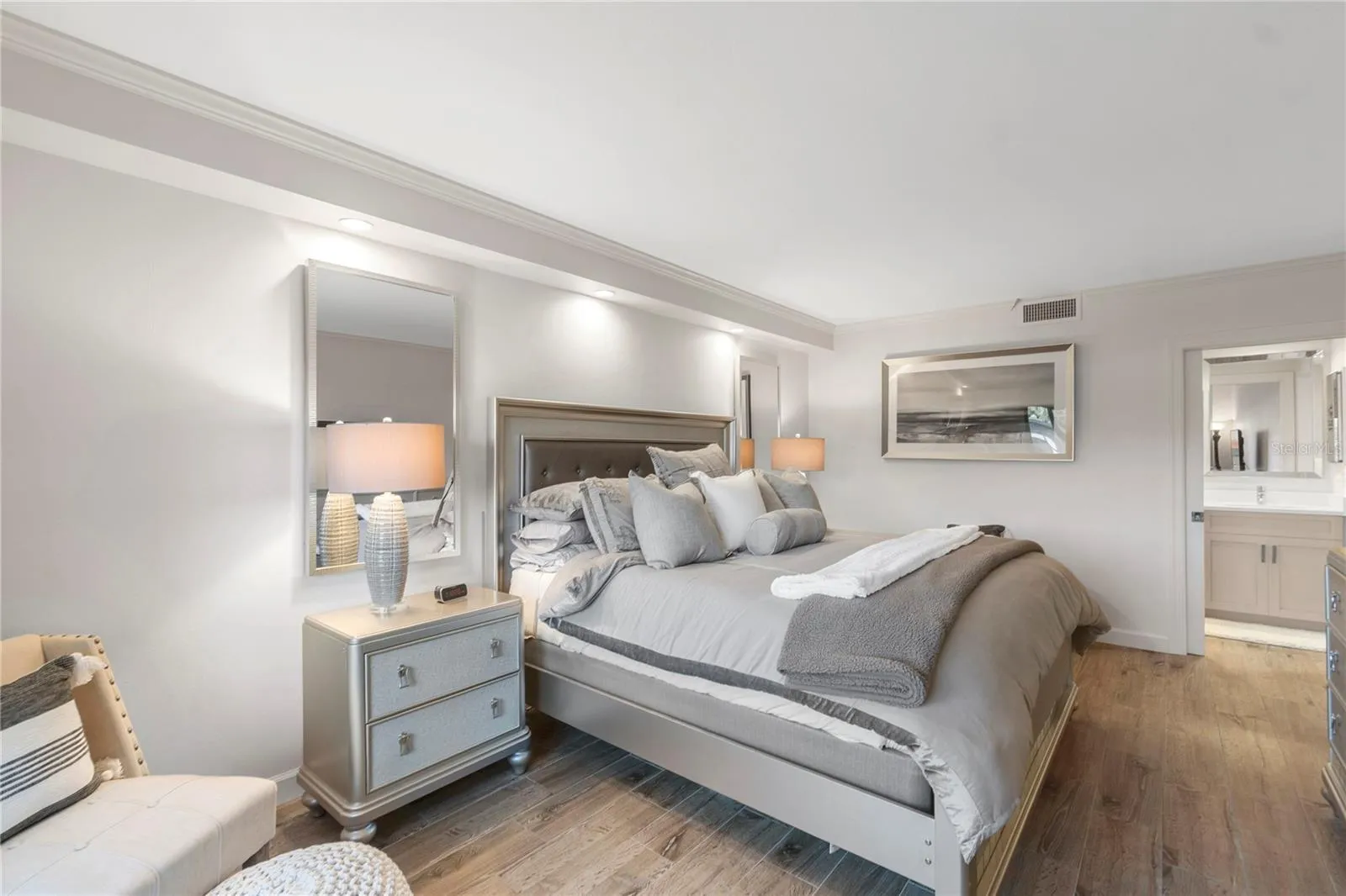 The renovated kitchen is both beautiful and functional, featuring custom cabinetry, durable stone countertops, and stainless-steel appliances. The split-bedroom layout ensures privacy: a serene primary suite offers generous custom built-out wardrobe space and a refreshed en-suite bath with a walk-in shower, while the flexible, oversized guest bedroom boasts a generous, custom built-out walk-in closet and sits adjacent to a second, well-appointed full bath.
