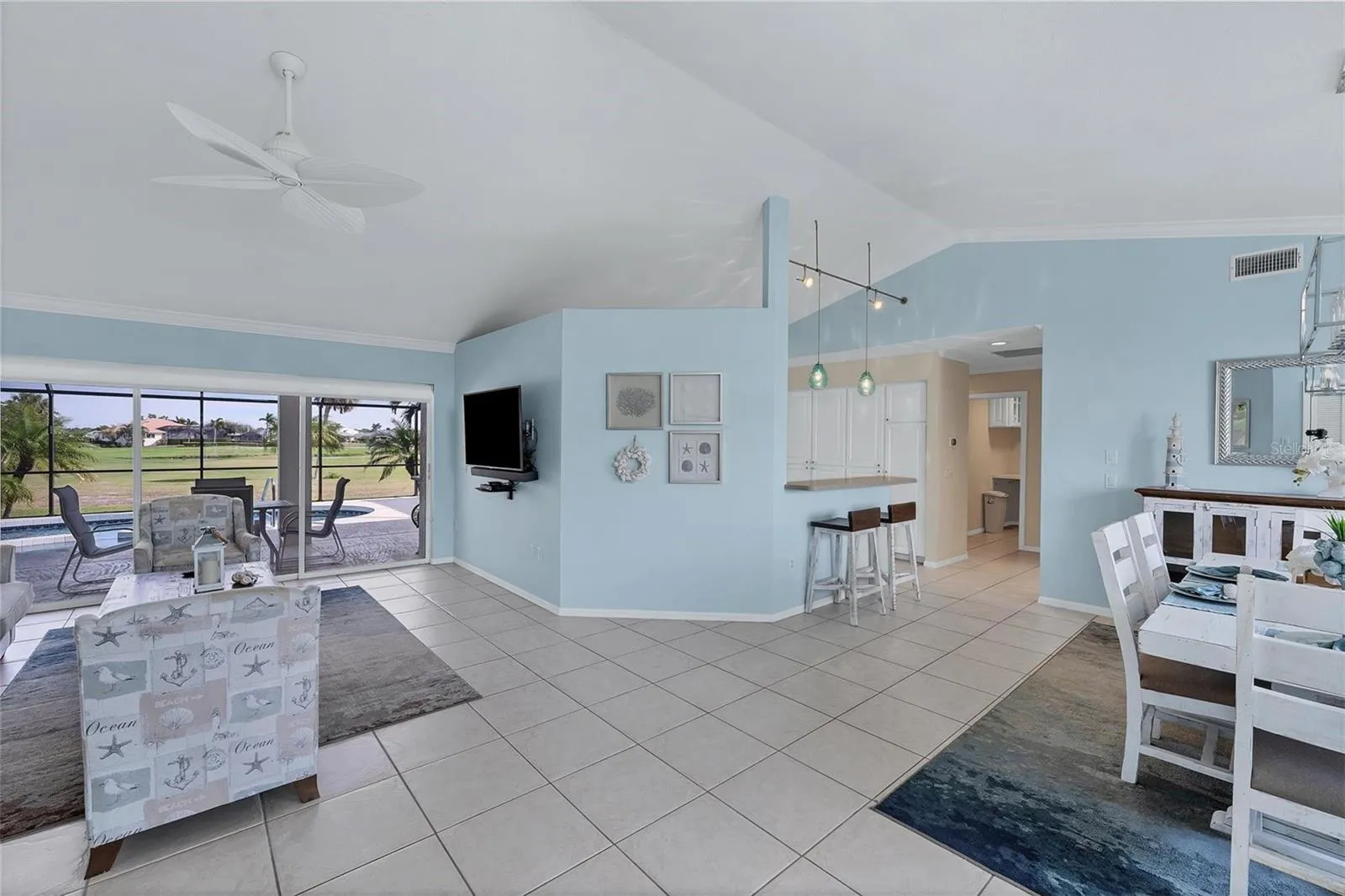 Step inside to discover a bright, open-concept living area filled with natural light. The stylish great room features elegant coastal décor, comfortable seating, and a state-of-the-art smart TV, creating the perfect gathering space for friends and family. The gourmet kitchen is fully equipped with modern appliances, quartz countertops, and breakfast bar seating, opening seamlessly to the dining area with seating for six.