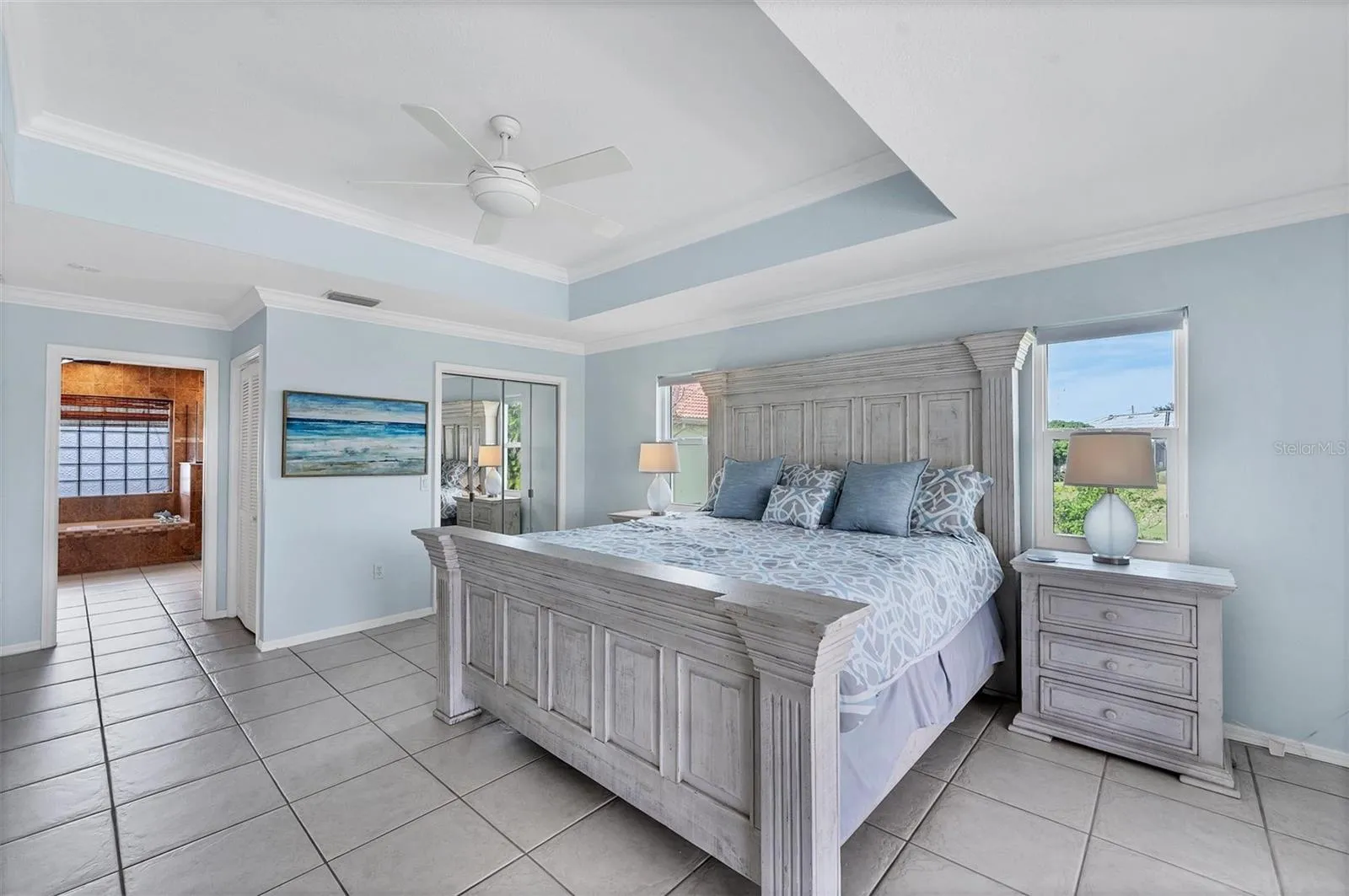 The primary suite offers a peaceful retreat with picturesque golf-course views, a luxurious en-suite bath, and generous closet space. Two beautifully appointed guest rooms provide comfortable accommodations for visitors, each thoughtfully designed with comfort and style in mind.