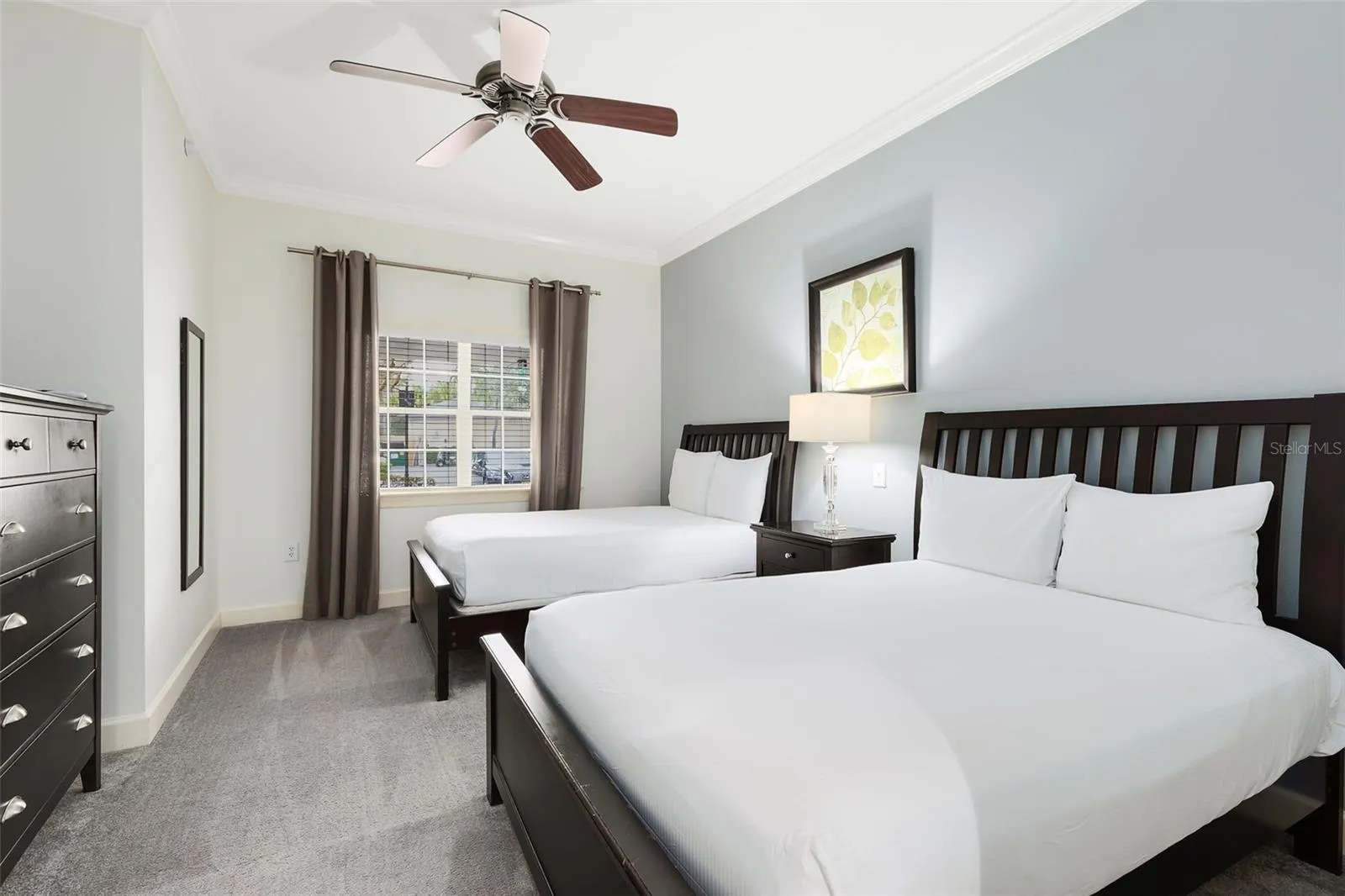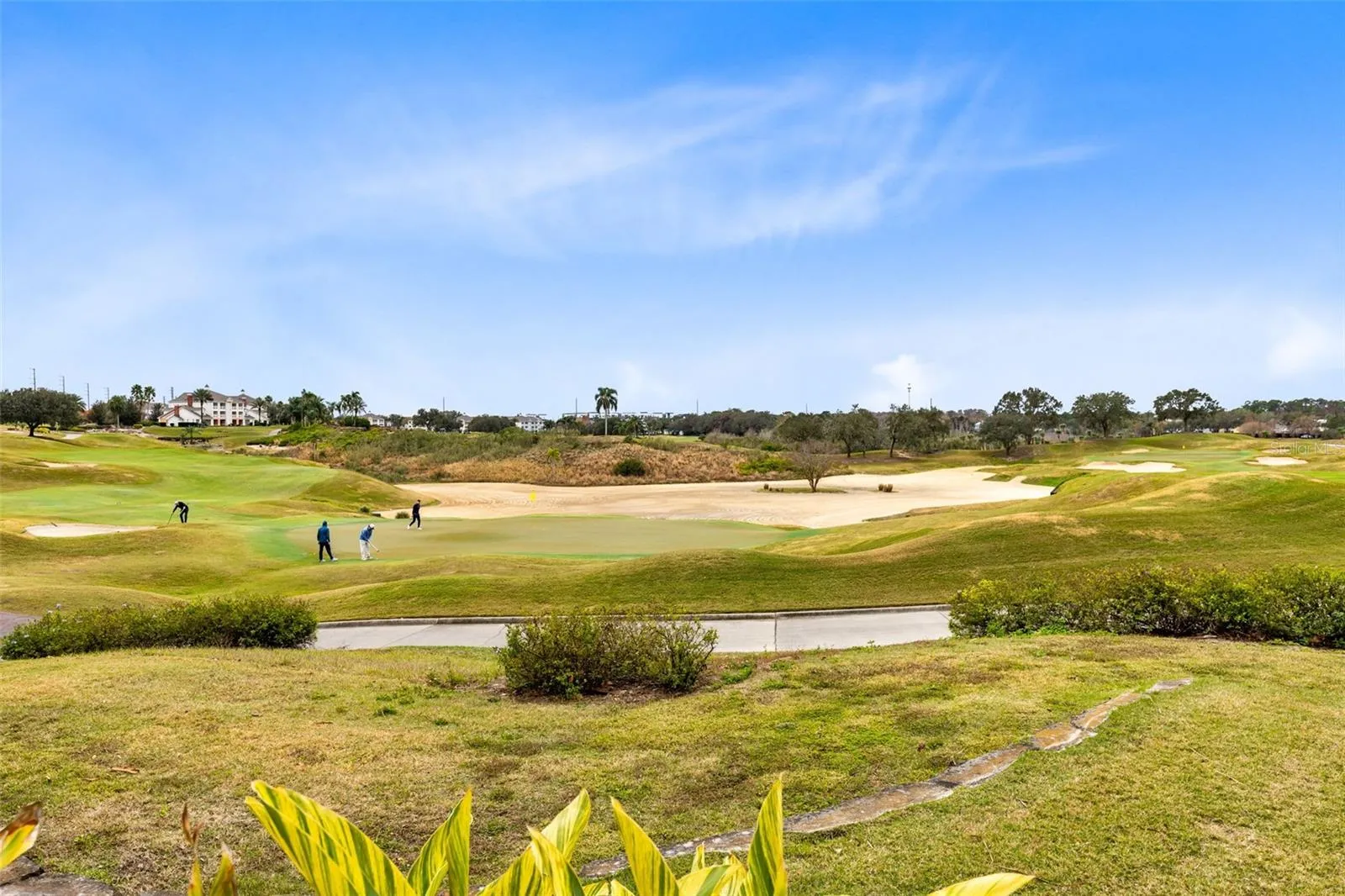 One of the best end-unit locations in Centre Court tucked away in a protected corner overlooking a garden area to the side and view of nothing but golf holes and sunsets from the bright and airy living room and open back patio. This condominium comes fully furnished with an inviting, sleek modern look in the furnishings, décor and fittings and offers stylish wood-look flooring in the living and dining area, and primary bedroom. On the ground floor, it is ideal for those who prefer not to deal with stairs or elevators, and for those needing more accessible accommodations, This condominium features some useful additions to the bath area to accommodate those with limited mobility. Standard in all Centre Court units are quality features such as fitted wood kitchen cabinets, stainless steel appliances, granite countertops, crown molding and tray ceilings. The end unit also has a handy outdoor storage closet ideal for golf clubs, bicycles and sports equipment, so they are ready and waiting for you on each visit to your personal Florida home. There is an active membership to the Reunion Club to give the option of full access to all Reunion’s outstanding amenities, including tennis and pickleball courts adjacent to this condominium, and the property has an excellent rental history with future bookings in place. Be sure to put this one at top of your list, as it will not last long.