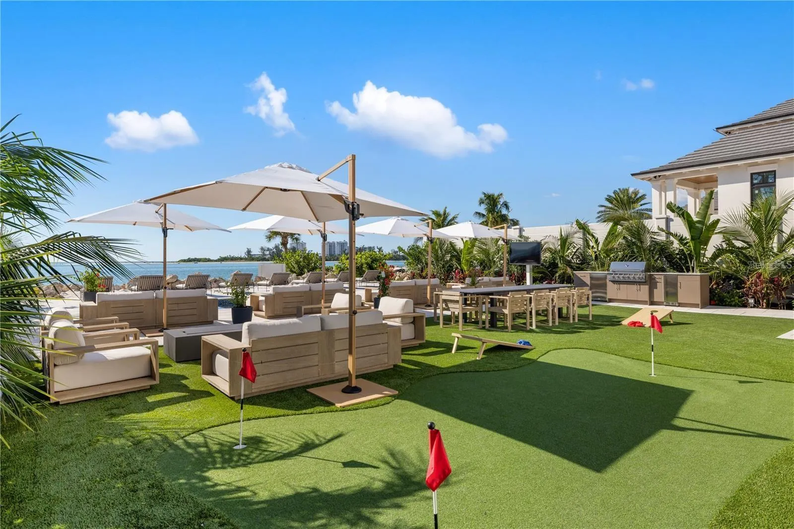 Pull into the property through the gated entry, with a paved driveway for ample parking. The ground level offers a 3-car garage, spacious private fitness studio with AC, large flex space/storage room, and huge game room that leads out to the truly special backyard – with premium turf, silica sand and a putting area. Host a sunset dinner with the full outdoor kitchen, including a freezer, wet bar, beverage center, ice machine, and 6-burner grill. Have a drink while sitting in the pool facing the ocean, relax in the champagne spa hot tub, or tan on the sun shelf. Put your toes in the sand area of the backyard, or take the paver steps down to the private beach and swim in the ocean – the ultimate paradise.