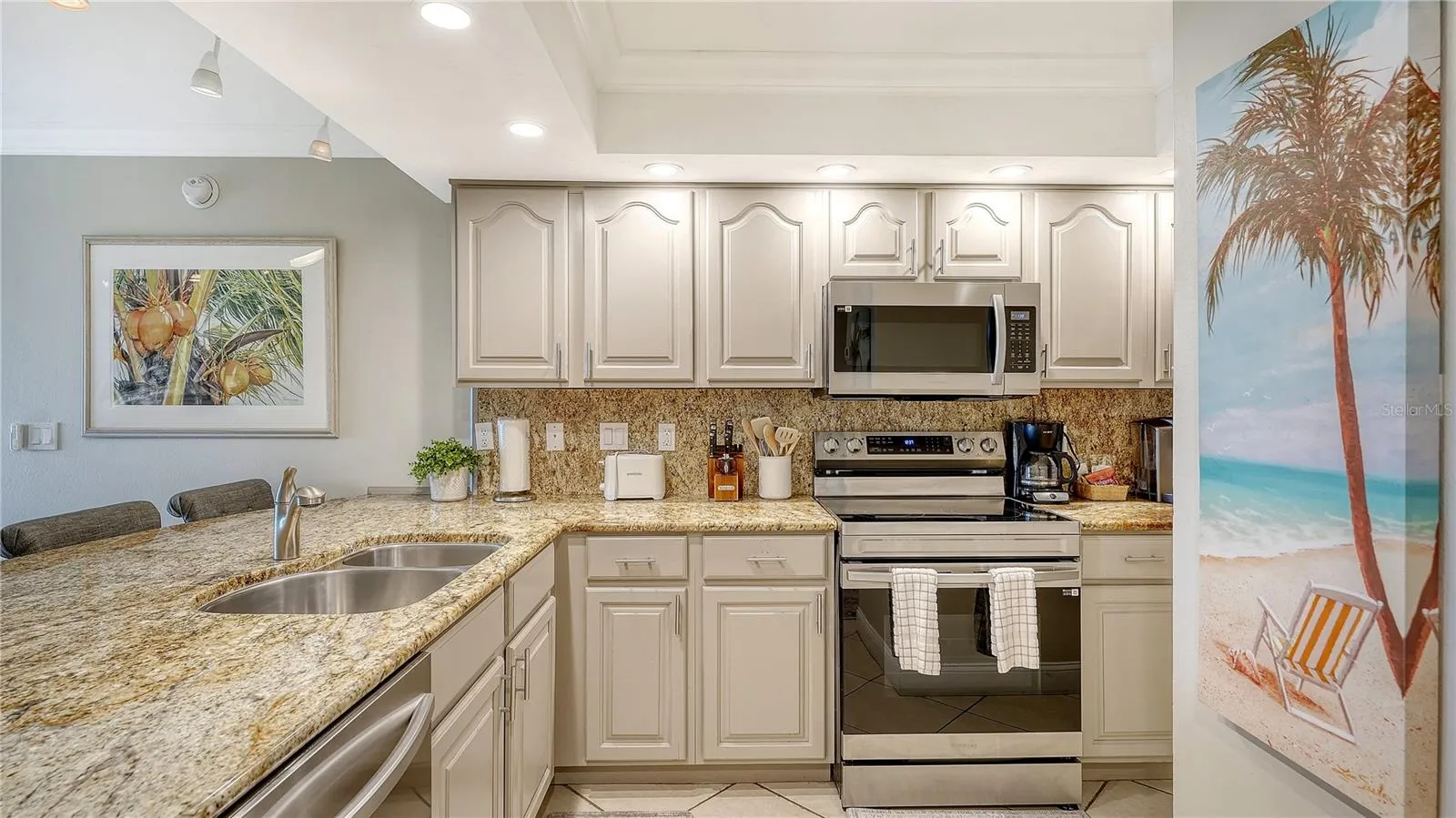 The light-filled interior features oversized tile flooring, updated windows and sliders (2009), and a well-appointed kitchen with granite countertops, contemporary cabinetry, modern appliances, and plumbing and electrical upgrades completed in 2006. Designed for effortless coastal living, the open layout seamlessly connects the kitchen, dining, and living areas. Floor-to-ceiling sliders lead to a private patio and screened-in lanai, both just steps from the beach, allowing indoor and outdoor spaces to flow together naturally.
