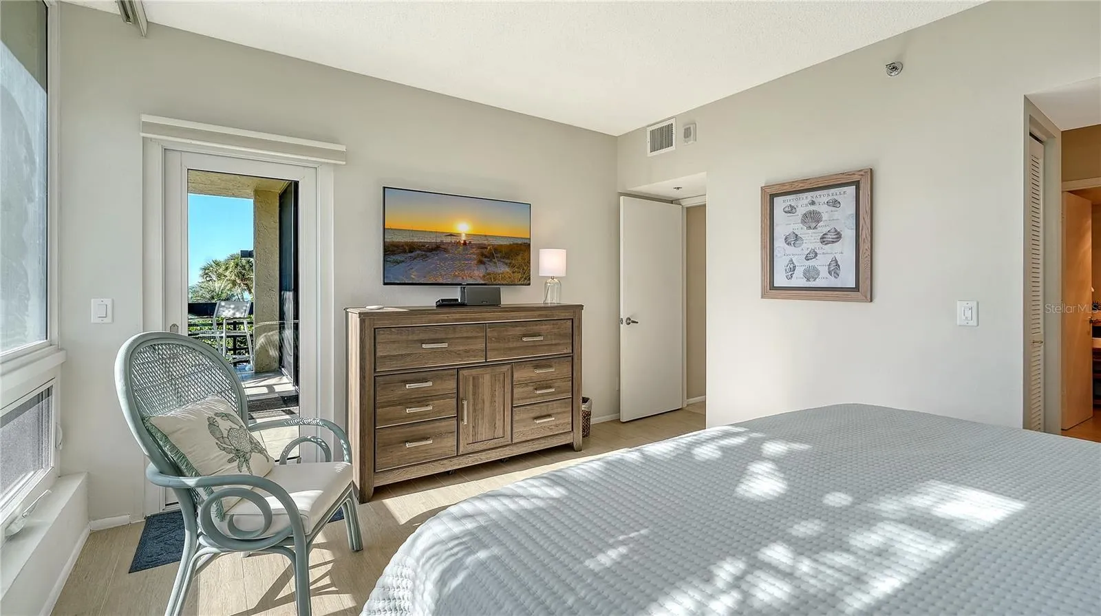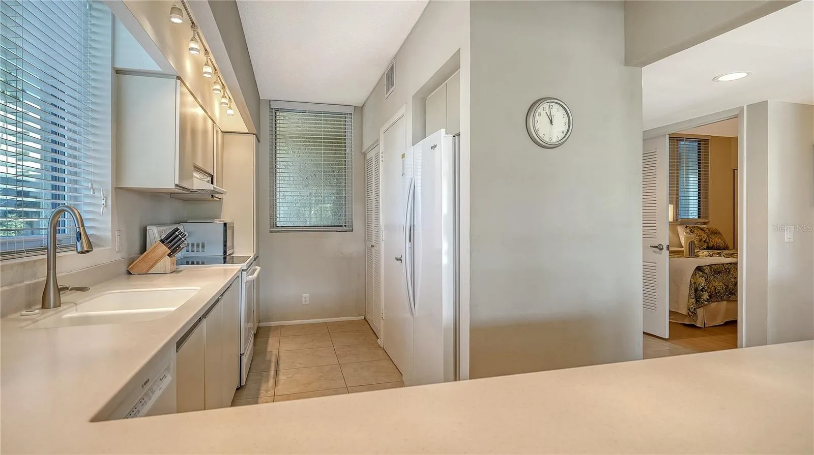 The spacious living and dining area is framed by floor-to-ceiling glass, opening directly to the screened lanai with views of the community’s lush landscaping, pool deck, and the Gulf’s sparkling waters. The updated eat-in kitchen includes all-white appliances, LED lighting, Corian countertops, and a convenient breakfast bar pass-through—ideal for casual meals or entertaining.