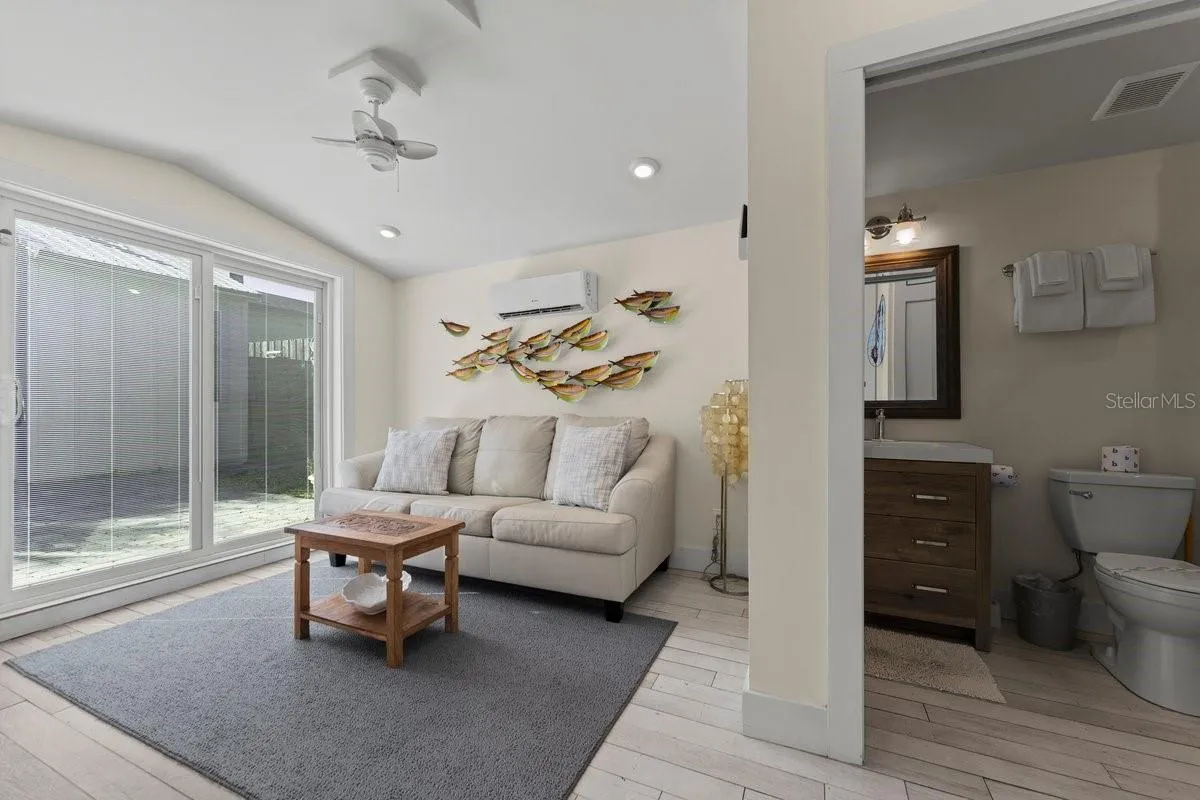 The main home features two cozy bedrooms, a full kitchen, and airy living spaces that blend vintage coastal charm with modern comfort. The third bedroom is a separate private cabana beside the pool, complete with a futon bed and half bath.