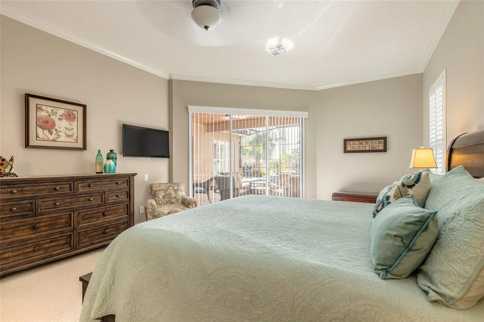 Completely refinished pool enclosure with new screen, featuring integrated lights for magical evening swims.