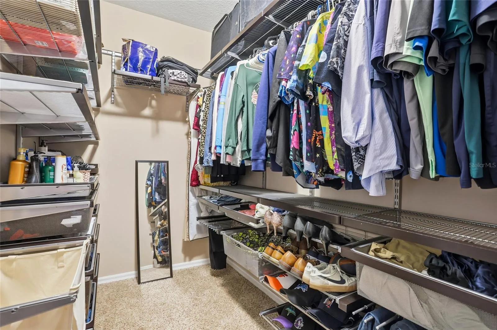 Two well-situated guest bedrooms sit on one side of the home, offering privacy and convenience, while the spacious primary suite is tucked toward the back. Enjoy a generous walk-in closet with built-in shelving and a spa-inspired bathroom complete with double sinks, a soaking tub, and a separate shower.