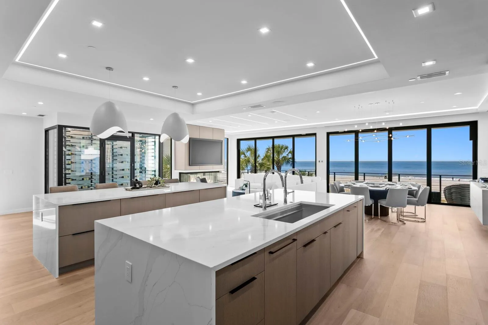 Modern sophistication meets exceptional beachfront living in this new construction coastal estate by Tulia Home Designs. Designed for refined living and effortless entertaining, the residence offers expansive light-filled interiors, panoramic beach views, elegant finishes, and a dramatic rooftop terrace atop the main home. With 9,271 AC sq ft combined, the property includes a Main House with 7,440 AC sq ft and an attached Guest House with 1,831 AC sq ft, each with its own private entrance. The estate features 8 bedrooms total, with the main residence offering 6 bedrooms, 6 full baths, and 2 half baths, and the guesthouse offering 2 bedrooms, 2 full baths, and 1 half bath. Luxury appointments include a residential elevator, automatic sliders on main level,floating staircase, wine cellar, a combined theatre and golf simulator room, game room, custom-built closets, and a smart home audio system with integrated in-wall touchscreens. Full retracting glass doors connect interior living spaces to multiple terraces overlooking the beachfront setting. The main level features imported Italian porcelain flooring, an entertaining bar, gym with sauna, and a guest suite or office, all opening directly to the resort-style pool and coastal surroundings. The second level offers elevated ceilings in the dining and living areas, a linear gas fireplace, and a custom chef’s kitchen with Tulia Cabinet Designs cabinetry, dual waterfall islands, Wolf appliances, a butler’s pantry, pantry, and a glass-enclosed wine room. This level also includes a sitting area or library and an additional ensuite bedroom. The upper level includes three more ensuite bedrooms and the private owner’s retreat. A separate foyer leads to the grand primary suite featuring a morning bar, spa-inspired bath with stand-alone tub and glass-enclosed shower, a custom wardrobe room, and full retracting doors opening to a private beachfront terrace. The rooftop terrace above provides additional outdoor living space with expansive Gulf views. The attached guesthouse offers a private living area, dining space, kitchen with waterfall island, two ensuite bedrooms, a powder room, a flex space, and its own rooftop terrace. The outdoor living area of the main home includes a pool with floating spa, sun shelf, covered lounging areas, and a well-appointed outdoor kitchen area. Construction features include pilings, concrete block exterior walls and impact-rated windows and doors. Additional enhancements include custom metal railings, tropical landscaping, a concrete driveway with turf inlays, and five garage bays (with power washer and car vac). A builder warranty is included (see builder documentation for full details). Located in a golf-cart-friendly coastal community with nearby parks, dining, shopping, an art center, and a library, and convenient access to regional airports and destinations. Short-term rentals are permitted. Available furnished at additional cost.