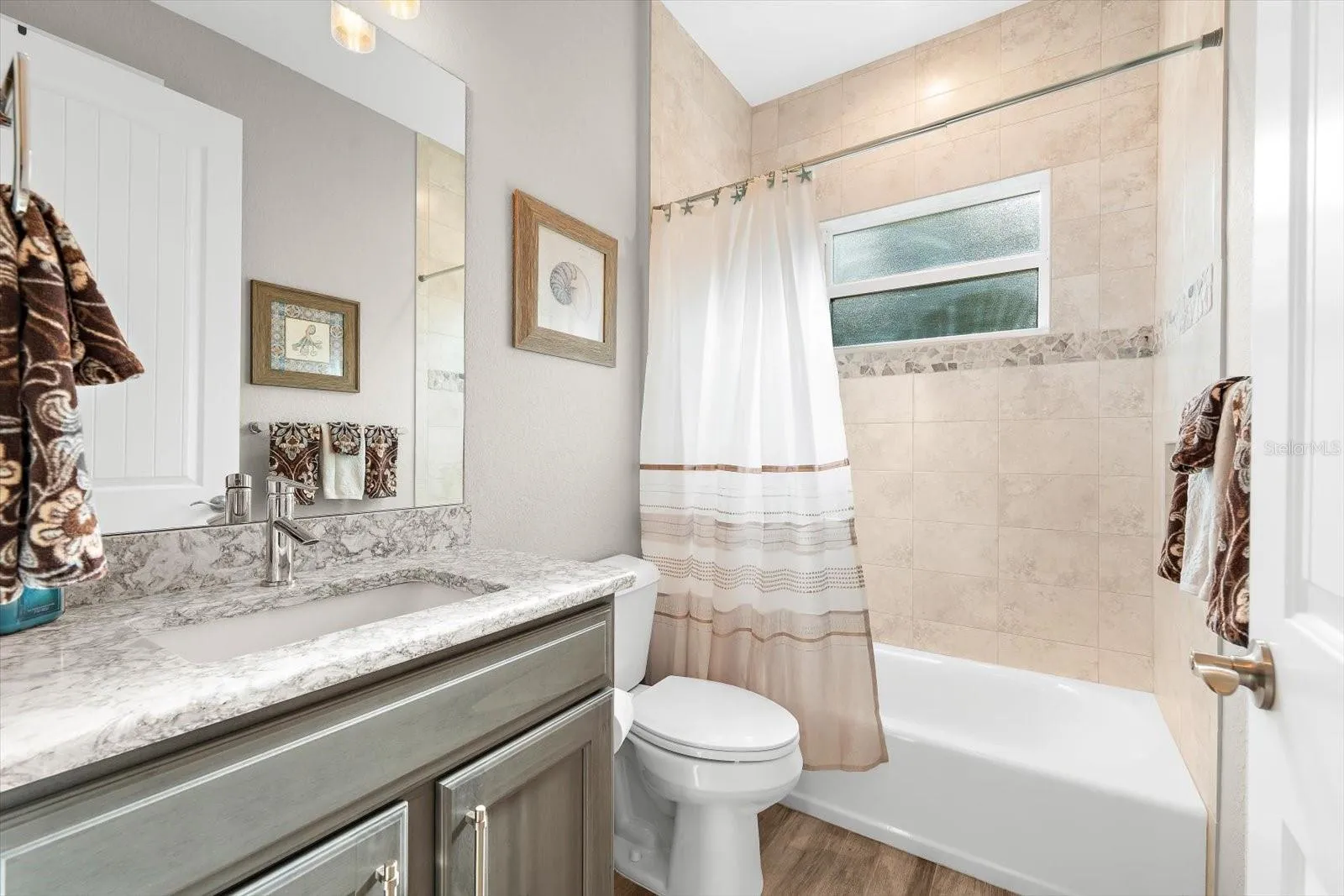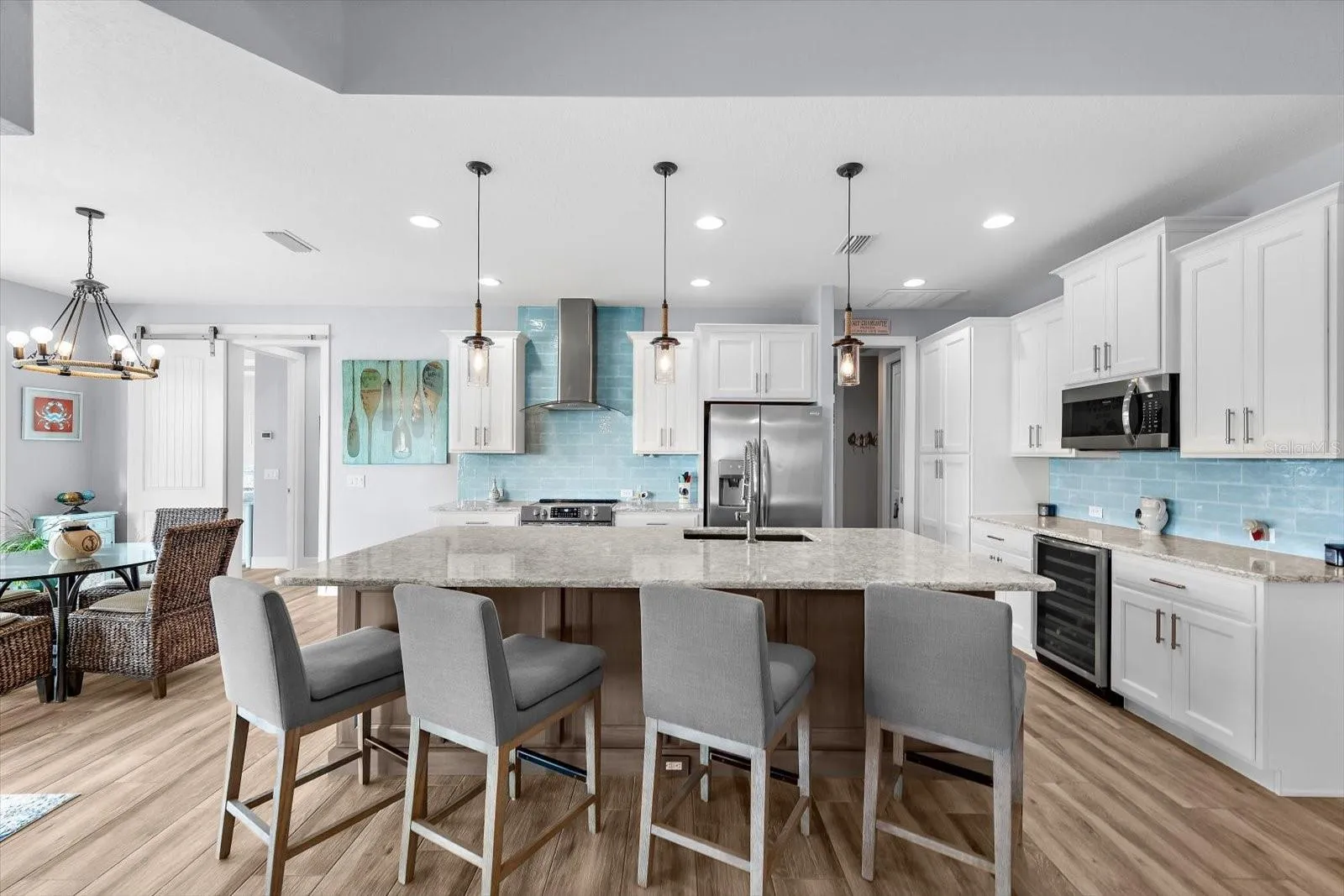 Inside, the home blends coastal charm with modern luxury. The oversized kitchen island, additional island cabinetry, Cambria Quartz surfaces throughout, refrigerator cabinet, subway tile backsplash, and upgraded range hood create a showpiece kitchen designed for gatherings. Plantation shutters, thoughtful LED rope lighting, and elegant finishes elevate every room.