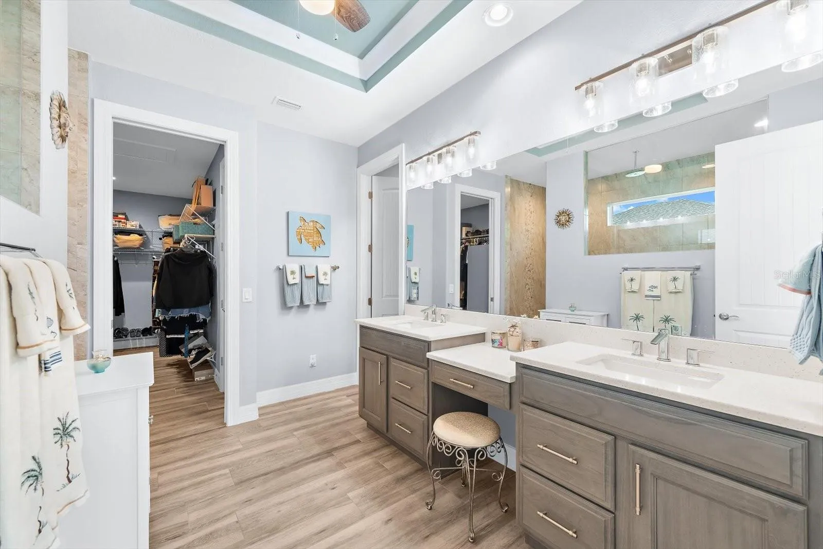 The primary suite is a quiet sanctuary—spacious, serene, and thoughtfully designed. The spa-inspired bath features a large tiled walk-through shower with a waterfall shower head, double closets, and custom-built bath cabinetry with double sinks and a beautifully integrated vanity sitting area that enhances both style and function.