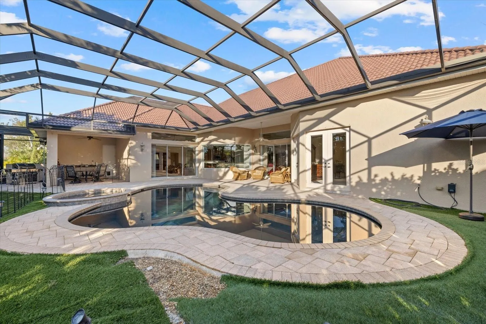 Under contract-accepting backup offers. Welcome to The Reserve, a premier gated enclave within Plantation Golf & Country Club. A pavered circular driveway, surrounded by lush landscaping, provides a striking entry and exceptional curb appeal. This exceptional residence, originally built by a respected local builder as his own personal home, features DUAL GARAGES accommodating up to 5 vehicles and additional room for a golf cart. One GARAGE IS AIR CONDITIONED and the other features a LOCKABLE STORAGE ROOM UNDER AIR. Step inside to an open concept design enhanced by soaring ceilings and bright, sun filled spaces that feel both spacious and welcoming. The open concept kitchen is a chef’s dream, complete with double-wall ovens and a seamless flow to the living and dining areas, ideal for entertaining. The luxurious primary suite offers an EXPANSIVE WALK-IN CLOSET and elegant finishes. The durable COMPOSITE TILE ROOF was REPLACED in 2023, ensures long lasting quality and peace of mind. Step outside to a stunning outdoor retreat with a lagoon-style SALT WATER POOL AND SPA overlooking the golf course just beyond your backyard, the POOL CAGE was REPLACED in 2020. While membership to Plantation Golf & Country Club is optional, it provides access to two 18-hole championship golf courses. Additional amenities include 12 tennis courts, a fitness center, a Jr. Olympic-sized pool and hot tub, as well as pickleball and bocce courts. The club also features two restaurants and bars, with social memberships available for non-golfers. NO FLOOD INSURANCE REQUIRED and NO CDD. Just 15 minutes away from several local beaches and the historic downtown of Venice. Don’t miss this opportunity, schedule your showing today!