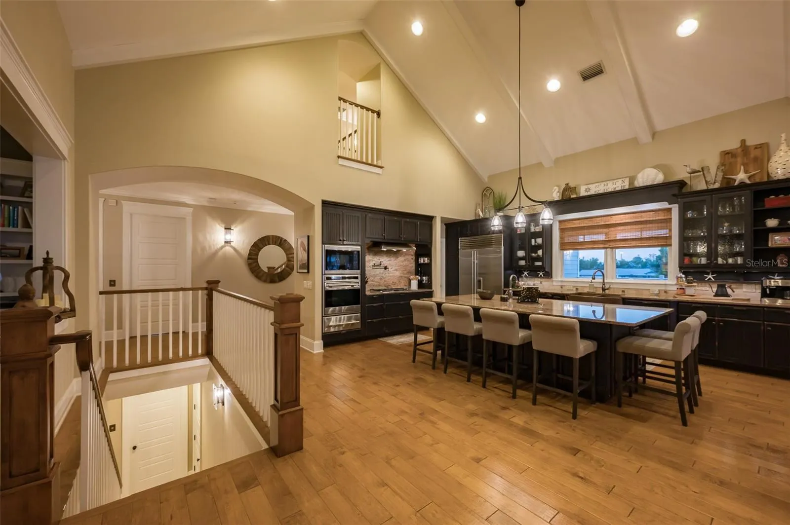 Welcome to this 4,995-square-foot architectural masterpiece designed by well-known architect Gene Aubry, featuring five bedrooms, five baths, an office, a second living area and a gym, all on 225 feet of direct bay frontage in Holmes Beach. This bayfront estate in the heart of Anna Maria Island reflects superior craftsmanship and thoughtful detail, from the hand-scraped maple flooring, metal roof, to impact-resistant Anderson windows, new high efficiency air-conditioning units, tankless water heater, an oversized garage with new epoxy flooring, an updated spa-style primary bath and an elevator servicing all levels. The chef’s kitchen is equipped with Sub-Zero refrigeration, Wolf and Bosch appliances, a new built-in ice machine, beverage cooler and custom cabinetry ideal for everyday living and elevated entertaining. Additional features include whole-home audio and security systems, a dedicated gym with epoxy flooring and a bonus room pre-plumbed for an efficiency kitchen. Outdoors, professional landscaping with curated lighting surrounds a saltwater pool and spa with all-new equipment. Irrigation is supported by a rain-fed cistern system. A composite wraparound deck that is plumbed for an outdoor kitchen, and a mosquito-control misting system for added comfort while enjoying unobstructed bay views. Boaters will appreciate the new seawall, 10,000-pound lift and fish cleaning station. This rare waterfront estate presents the opportunity to own a residence that embodies architectural integrity, refined island living and modern luxury.