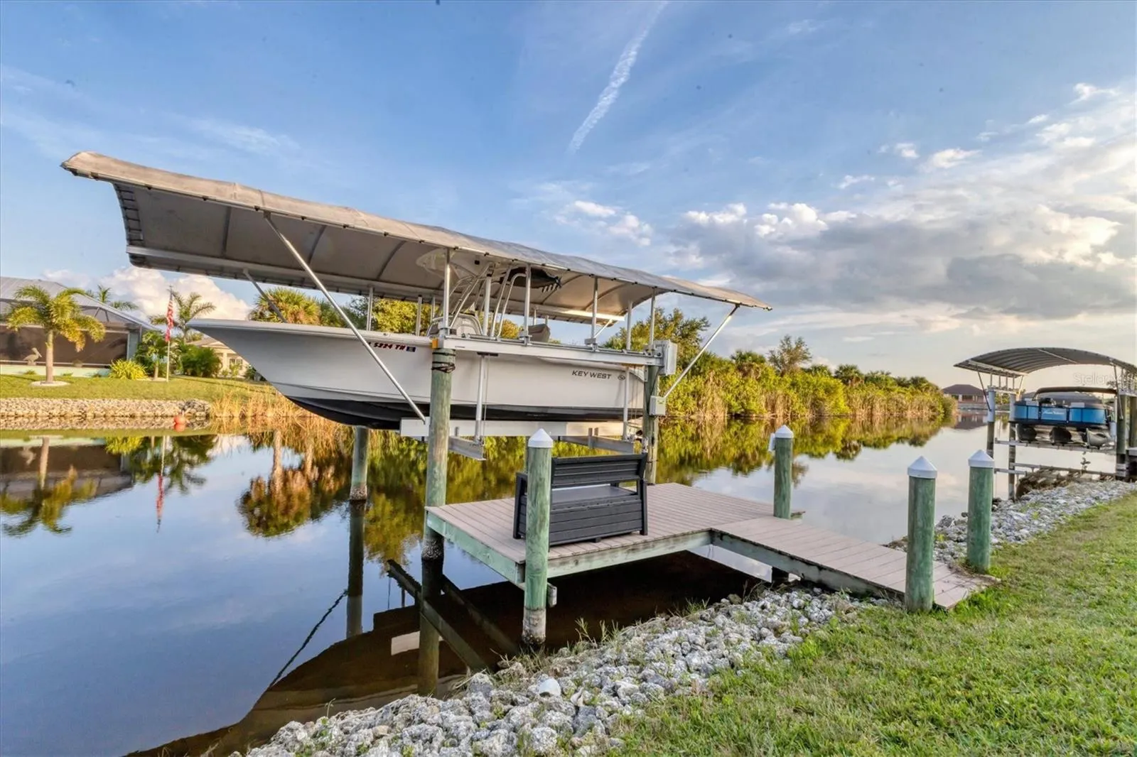 Step outside to your private waterfront paradise. The heated saltwater pool features double dolphin fountains, a 10×27 covered area, outdoor shower, extended paver spaces, and a 45×19 pool deck with an additional 18×11 sitting area. Lush landscaping includes beautiful palms and Areca palms for added privacy, plus paver edging, a paver driveway, and a walkway leading to the front door. Waterfront features include rip rap for added shoreline protection, GEM remote-control boat lift system, an 8,000-lb lift with 2022 motors, 2023 bunks, and a new 33-ft canopy installed in 2023. Additional updates include 2022 garage door openers, 2022 washer and dryer, and an irrigation system fed from the canal.