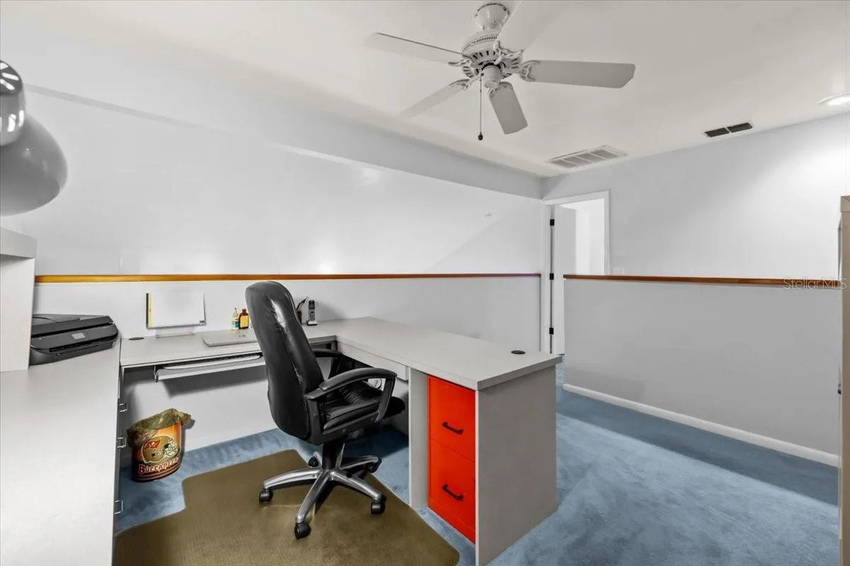 The spacious layout features a primary bedroom and second bedroom/den conveniently located on the first floor, while the upstairs loft offers a custom built-in desk—perfect for a home office—and an adjoining third bedroom ideal for guests or family. The gourmet kitchen is a chef’s delight, complete with granite countertops, a custom-designed breakfast bar, stone backsplash and ample counter space. All major appliances convey, including the refrigerator, microwave, range/oven, and dishwasher.