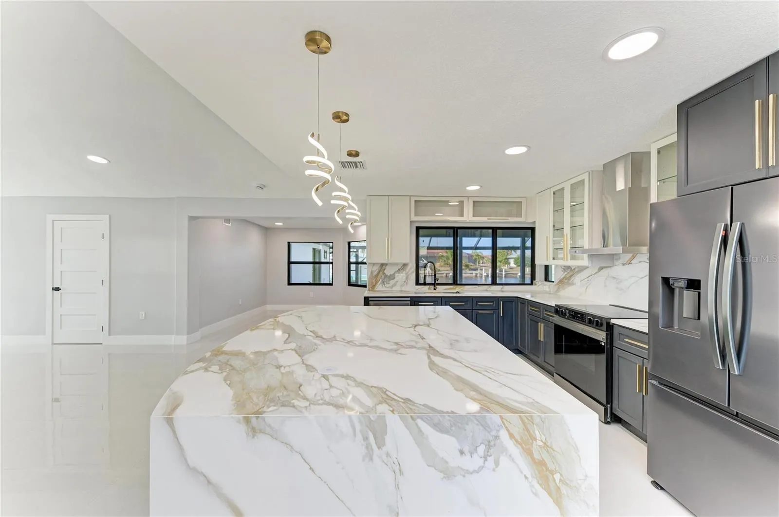 The STUNNING GOURMET KITCHEN serves as the heart of the home, offering a MASSIVE QUARTZ ISLAND, PREMIUM CABINETRY WITH GOLD HARDWARE, and BRAND-NEW STAINLESS-STEEL APPLIANCES. A PASS-THROUGH WINDOW overlooks the pool and outdoor entertaining space, further enhancing the home’s indoor-outdoor synergy. The open concept living area includes a SPACIOUS CAFÉ-STYLE DINING NOOK WITH VIEWS OF THE POOL, creating an inviting setting for both casual dining and elegant gatherings.
