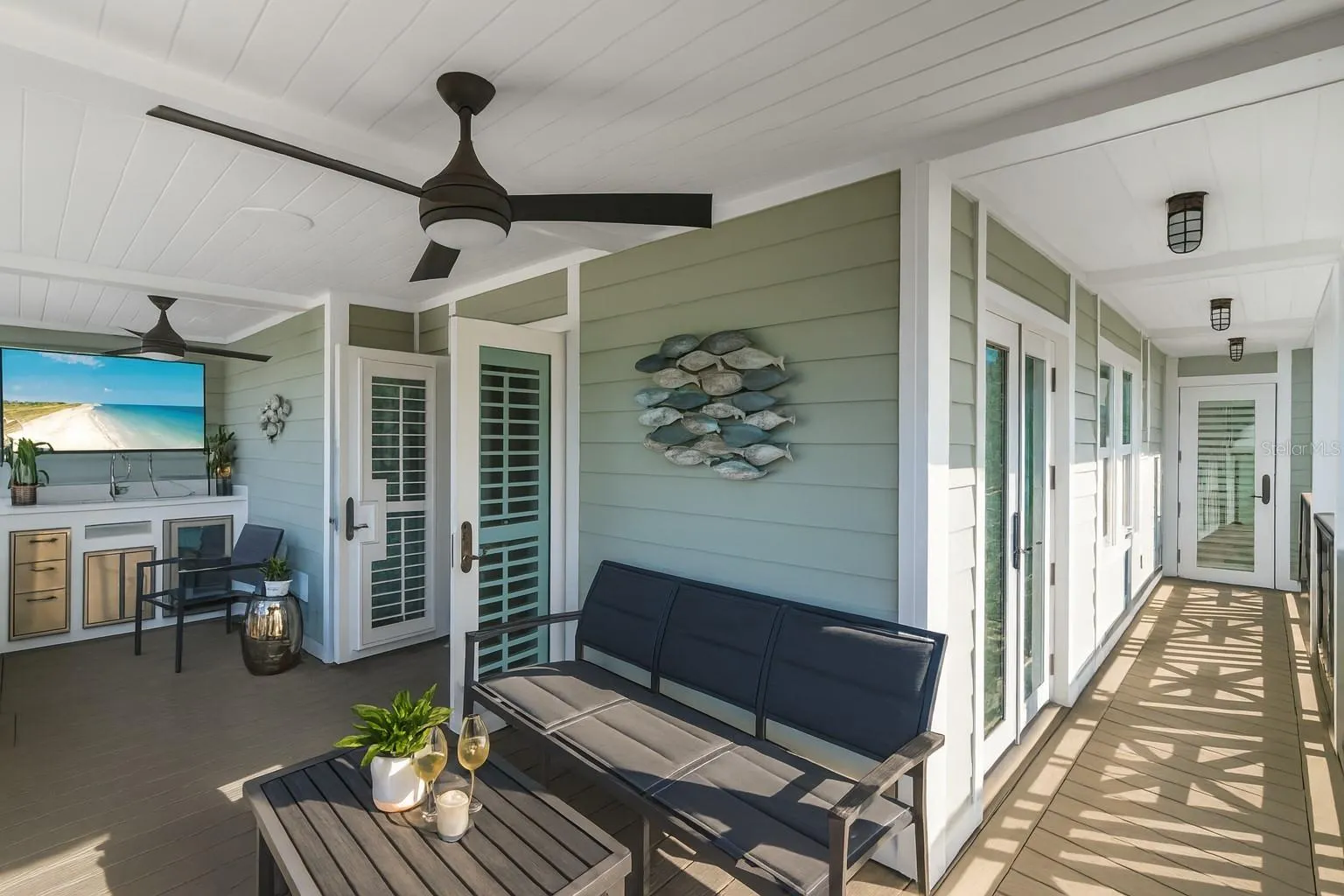 Inside, every detail has been thoughtfully customized. Hardwood flooring throughout, designer lead-crystal door knobs, and curated finishes elevate every room. The chef’s kitchen features custom cabinetry, marble counters, premium appliances, pantry, wine fridge, and a striking backlit wall of glass-front cabinets. A generous dining area and breakfast bar make hosting easy. The great room includes a second fireplace surrounded by custom lighted shelving, while numerous double doors with plantation shutters open to wraparound porches that embrace Gulf breezes and sunset hues. An additional spacious guest bunk room—thoughtfully designed —offers a fantastic retreat for visiting friends, extended family, or those seeking flexible rental potential.