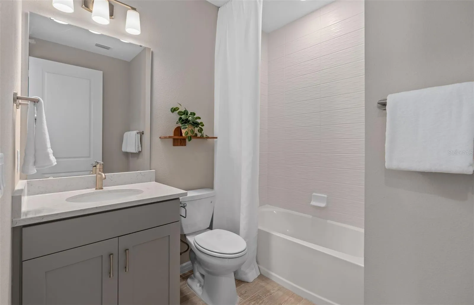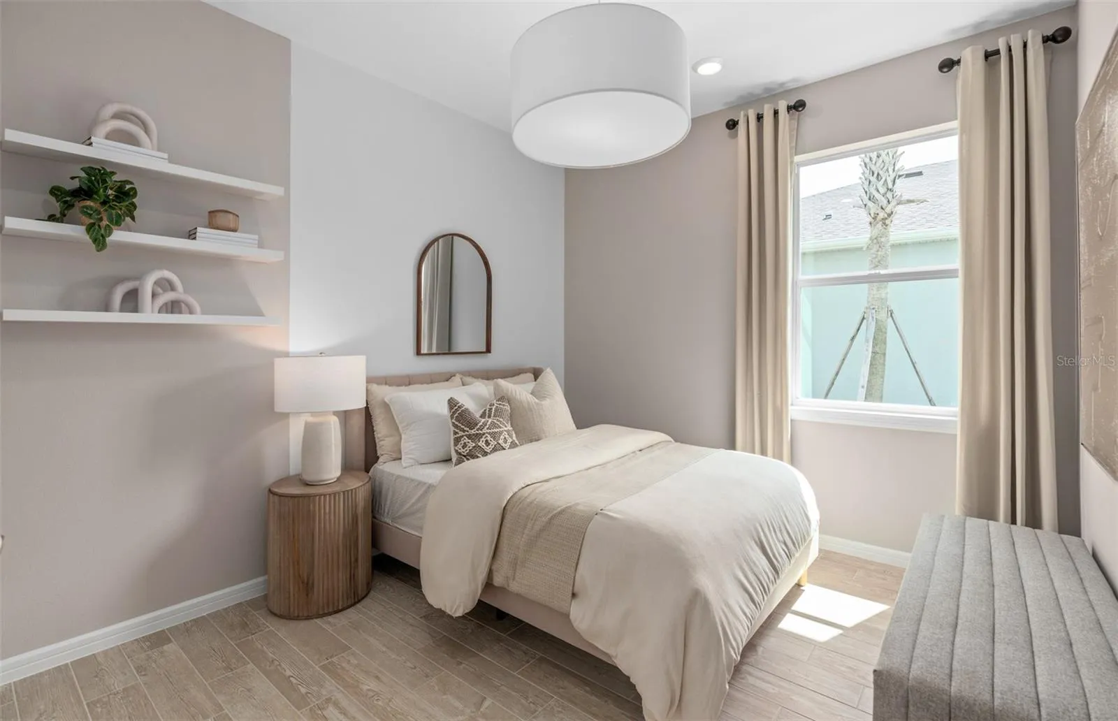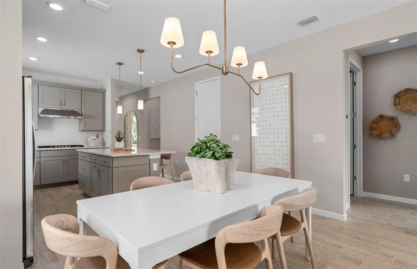 The one-story Contour home by Del Webb features 2 bedrooms, an enclosed flex room, 2 bathrooms, a 2-car garage, and an extended covered lanai—ideal for both comfortable living and easy entertaining. The heart of this home is the stunning kitchen, designed for both beauty and function. It’s appointed with Soft-Close Dana White Cabinetry, elegant quartz countertops, and a striking decorative tile backsplash. The upgraded Whirlpool appliances—including a natural gas range and a refrigerator—along with a stainless-steel single-bowl sink and upgraded faucet, make this space a chef’s dream. Whether preparing meals or hosting guests, this kitchen inspires. The open-concept design flows seamlessly into the café and gathering room, both flooded with natural light from ample windows. A sliding glass door opens to the covered lanai, merging indoor and outdoor living for an inviting and relaxing experience. The owner’s suite, located at the back of the home for maximum privacy, offers a true retreat. The spa-inspired en suite bath features a dual vanity with quartz countertops, an enclosed toilet, a frameless glass-enclosed shower with a built-in bench and tile extending to the ceiling, a linen closet, and a spacious walk-in closet. At the front of the home, the secondary bedroom and bathroom are paired with the versatile flex room, providing privacy and space for guests or loved ones. The flex room can serve as a home office, hobby space, or anything that fits your lifestyle. Designer touches are evident throughout, with brushed nickel plumbing fixtures and hardware, a Whirlpool washer/dryer, and 2” faux wood blinds. Every detail of this home has been thoughtfully curated, from comfort-height toilets to the Sherwin Williams City Loft interior paint and 8’ interior doors. The exterior includes thoughtfully placed gutters. Inside, wood-look tile flows throughout. Don’t miss the chance to make this exceptional home yours. Schedule a tour today!