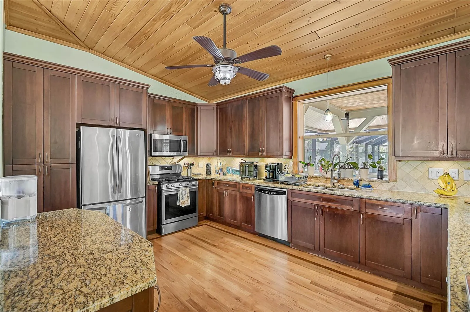 Private Key West–style retreat on 2.53 wooded acres in Osprey. Rarely does a property of this size become available in such a convenient location—just minutes from Pine View School, shopping, restaurants, and the Intracoastal Waterway—yet offering the privacy and space of a true country setting. This combination of acreage and accessibility makes the home exceptionally unique for the area. A generous 37×60 paver-brick patio surrounds the screened lap-style pool, now protected by a freshly updated pool cage. Multiple French doors open to wide second-floor decks overlooking the peaceful wooded backdrop. A recently added metal roof enhances durability, longevity, and value. Inside, the home features oak hardwood floors, vaulted tongue-and-groove cypress ceilings, and a striking wood-burning fireplace that add warmth and character throughout. The kitchen and baths retain their classic charm and present an excellent opportunity for updating to suit modern preferences. The flexible layout includes two potential primary suites and a first-floor bonus room with full bath that works well for guests or creative uses. The lower level remains plumbed for a second kitchen and laundry, offering an easy path for future installation or multigenerational living. With no deed restrictions and an expansive amount of usable land, this country estate in town offers endless potential—whether for hobbies, animals, enhancements, or simply enjoying the quiet beauty of its natural surroundings.