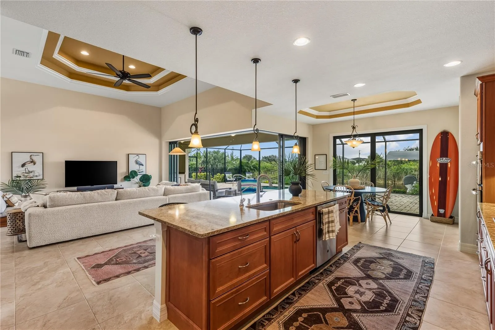 Step inside to soaring ceilings and expansive open-concept living areas, framed by hurricane-impact windows and doors. The chef’s kitchen is a showpiece, featuring 42” staggered cabinetry, a propane gas cooktop, built-in microwave and wall oven combo, beverage cooler, and an oversized quartz island perfect for entertaining. The dining area seamlessly connects to the great room, with sliding glass doors leading to the lanai and saltwater pool.