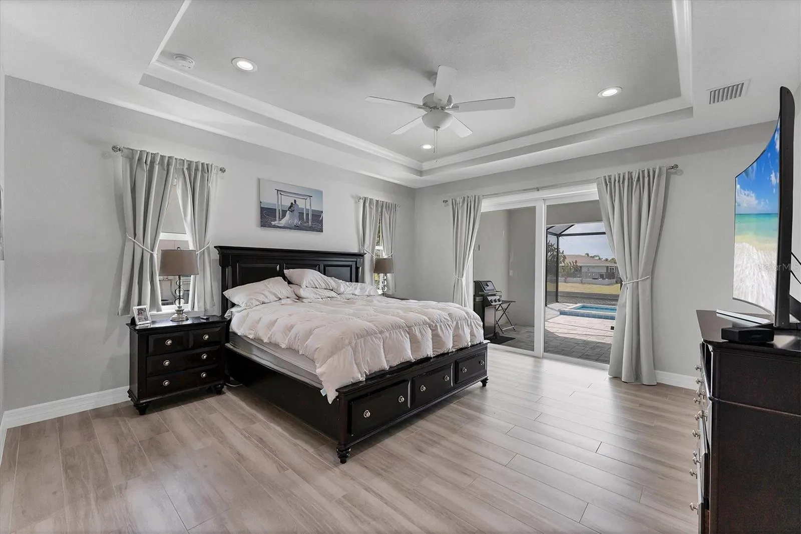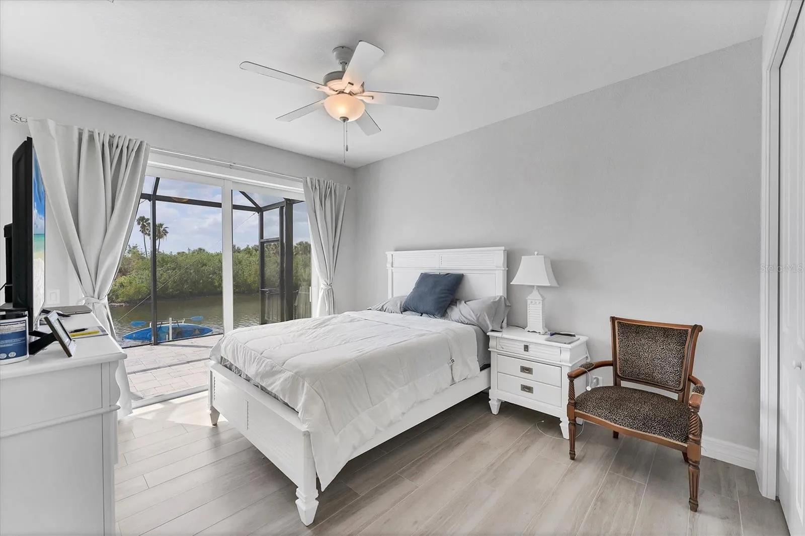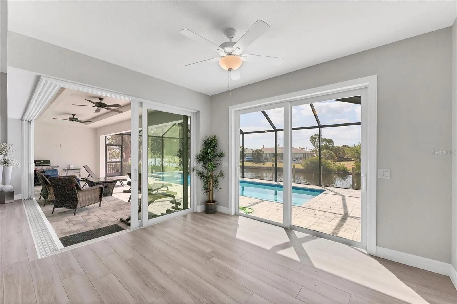 Outdoor living is exceptional with a heated pool and spa, a 72′ x 8′ -foot patio at the water’s edge, 100-foot paver walkway from front of home to the dock, and an 80-foot concrete seawall with water and electric, including 220V and a light pole. Additional features include a brick paver driveway, side garage walkway, lanai and pool deck, upgraded epoxy garage floor, R-19 spray foam insulation, and a full irrigation system with pump and diverter.