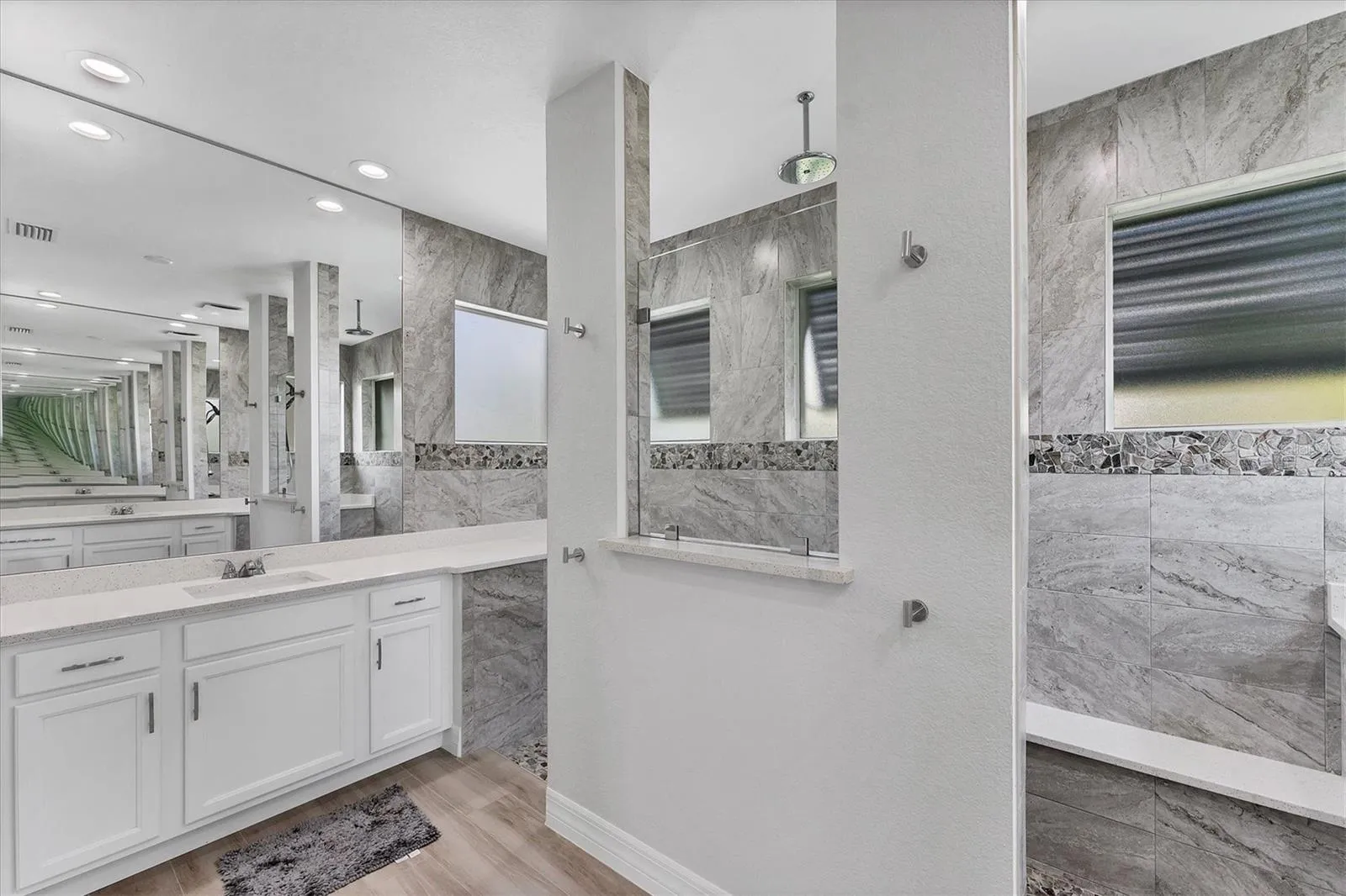 The primary suite serves as a spa-like retreat with dual rain and handheld showerheads, a built-in bench, and elegant quartz finishes. The guest bath is equally impressive, offering a rain shower complete with benches and niches for added convenience.