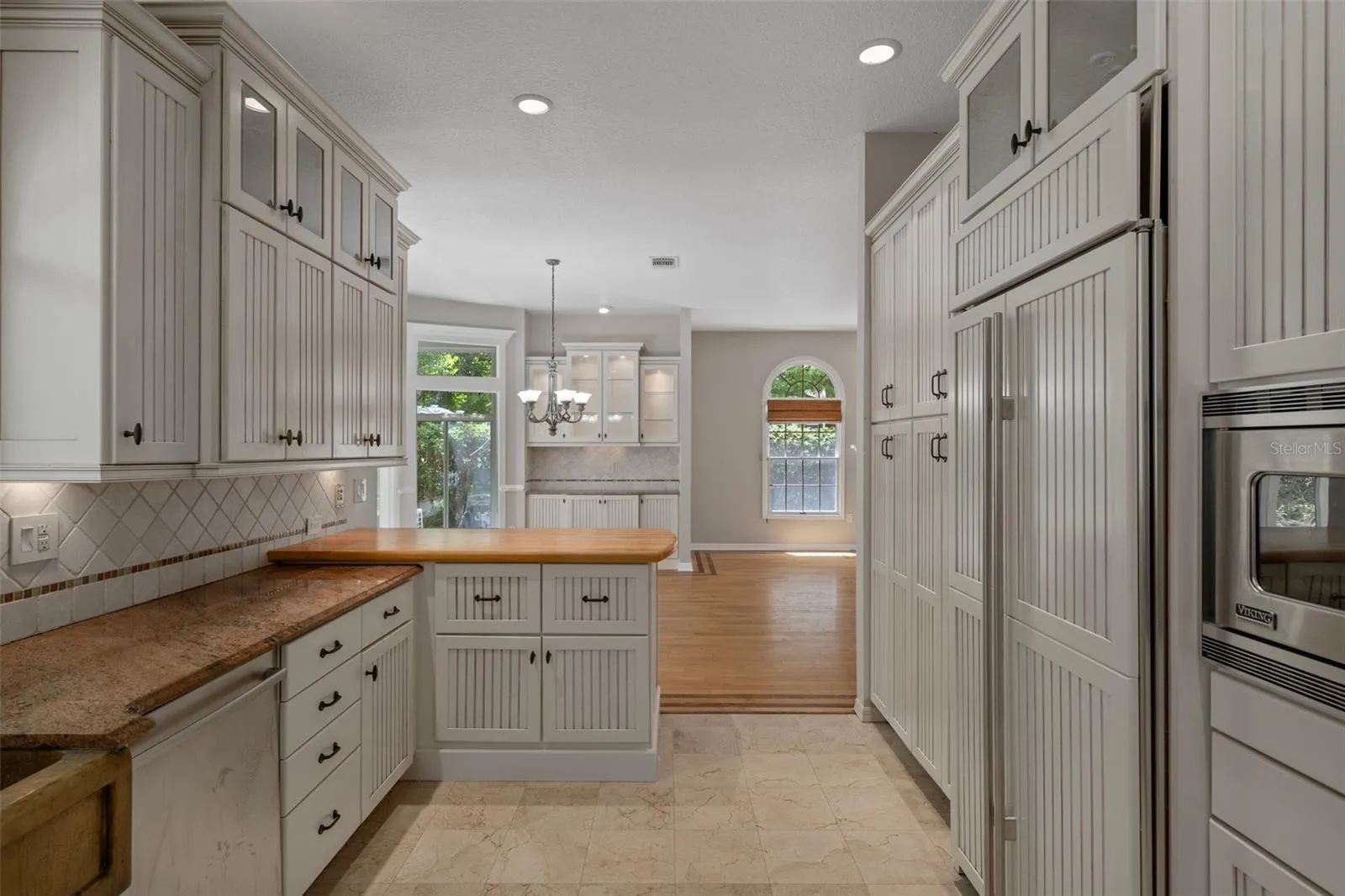 The inviting 21×19 family room includes a rustic wet bar, wood-burning fireplace, and floor outlets. The gourmet kitchen (16×11) features granite countertops, a butcher block breakfast bar, stainless steel appliances including a 6-burner stove with grill, custom cabinetry, indirect lighting, and a brass farm sink. An 11×13 breakfast nook with floor-to-ceiling windows overlooks the koi pond and dual waterfalls.