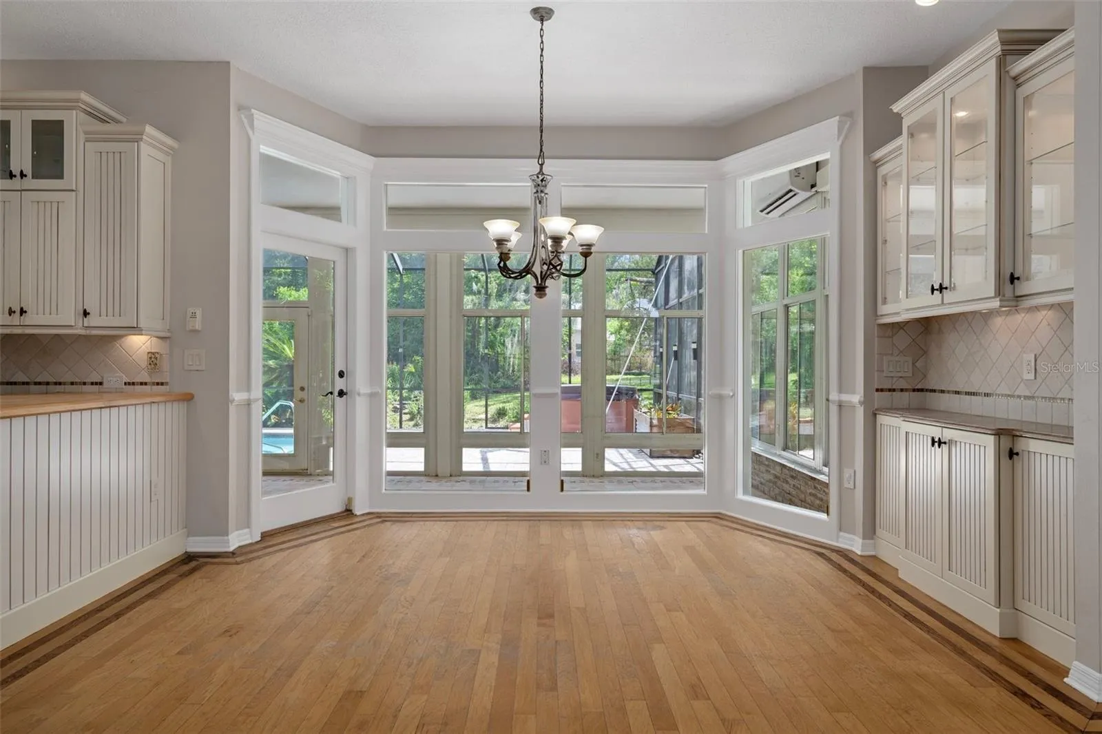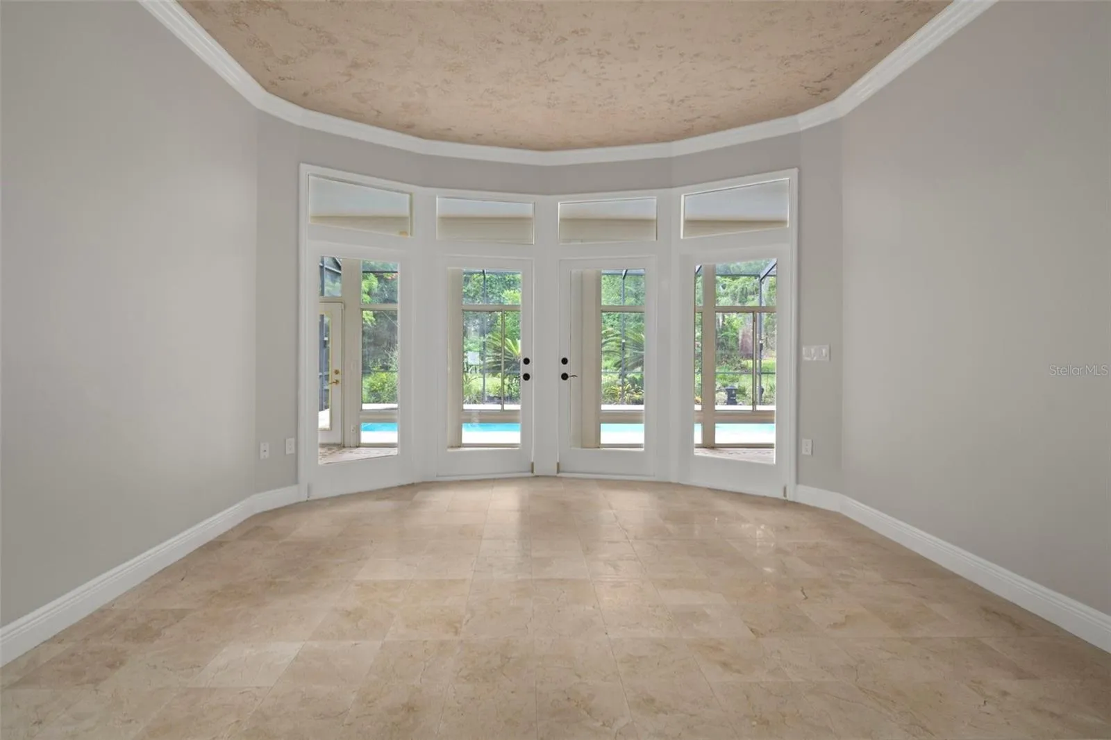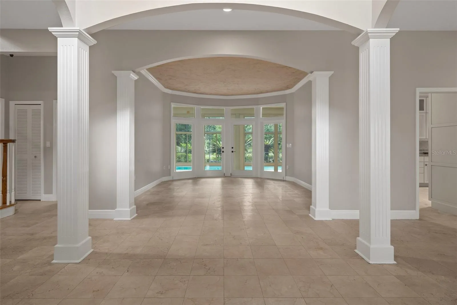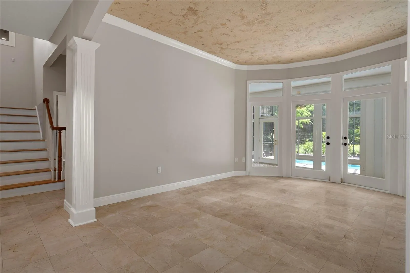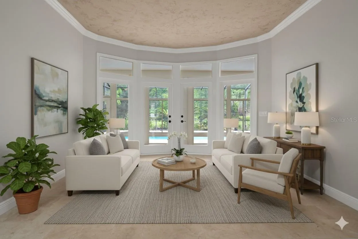 This immaculate 4-bedroom, 3.5-bath, two-story pool home with a koi pond features nearly 3,700 sq. ft. of refined living space. A welcoming 14×10 foyer with crown molding and 5.25” baseboards leads to a formal living room (16×14) with transom windows, French doors, and custom ceiling detail. The oversized dining room (18×15) offers a bay window and chair rail accents—perfect for entertaining.