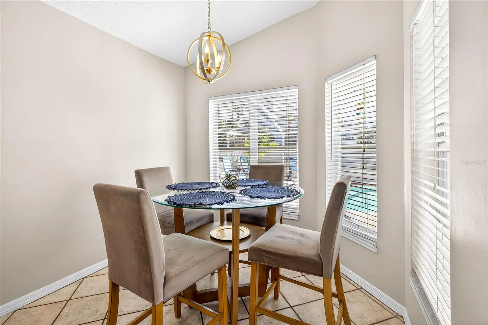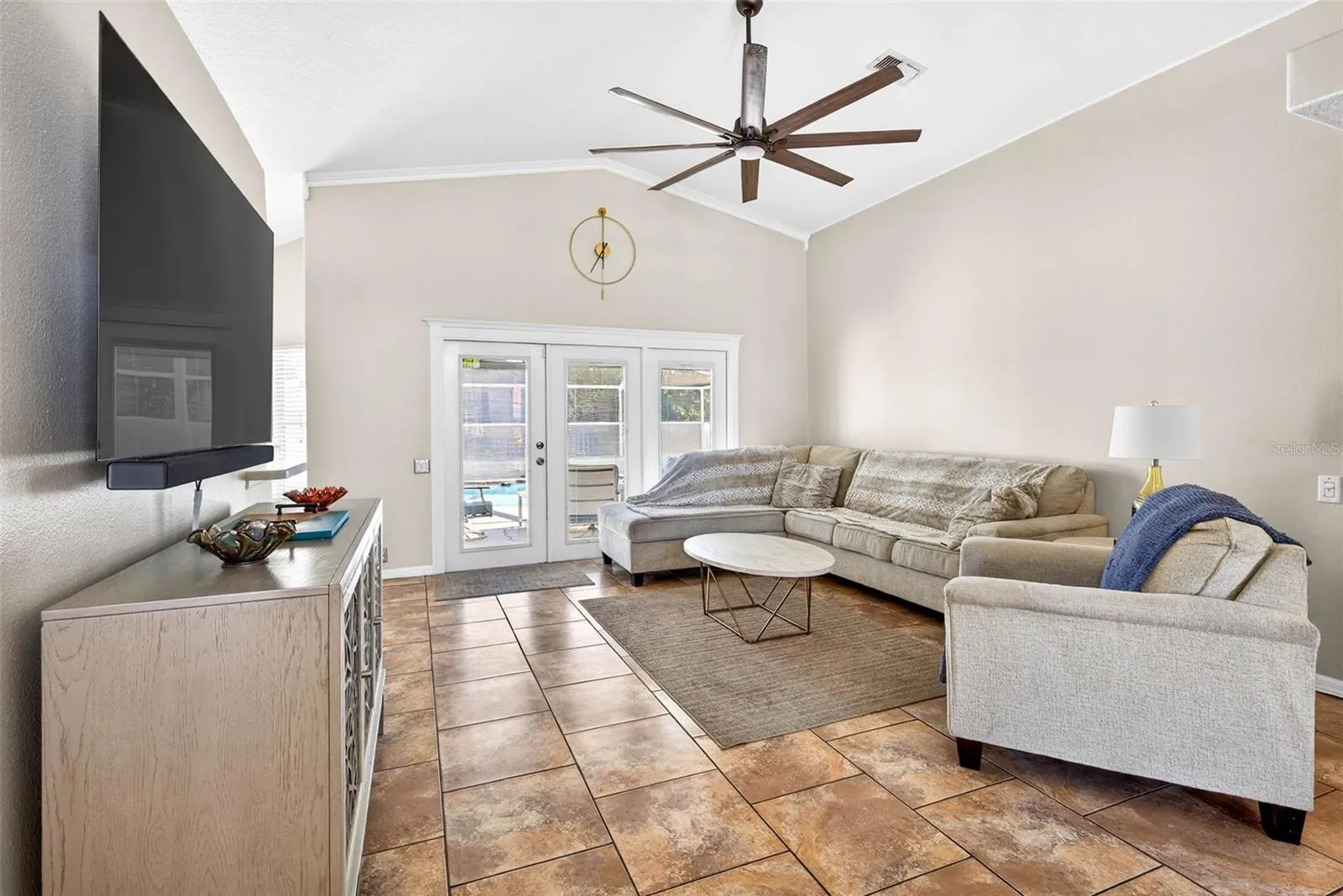 Indoor/Outdoor triple french doors seamlessly connect the main living area to the inviting screened-in pool and covered lanai, creating an ideal setup for relaxing or outdoor entertaining in a private, comfortable space.