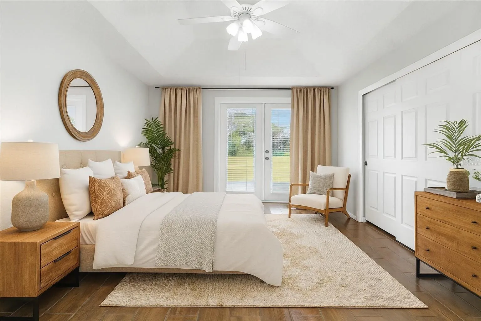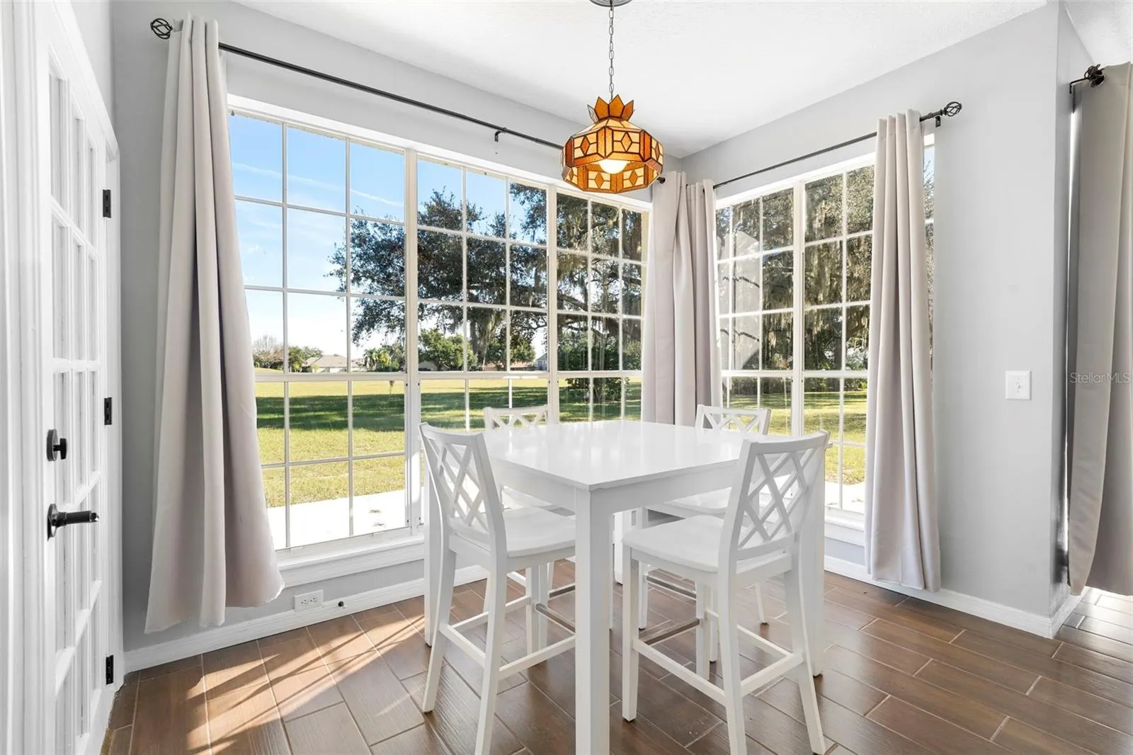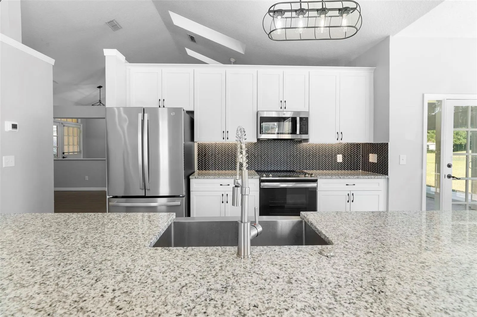 Wood-look tile flooring throughout provides easy upkeep with no carpet, perfect for allergy-friendly living. The gourmet kitchen showcases stainless steel appliances, a deep stainless farmhouse sink with a single-handle pull-down faucet, 48” white shaker cabinets, granite countertops, and a stylish glass backsplash. The spacious floor plan flows seamlessly from the living areas to the kitchen eating area and dining room, making this home ideal for entertaining. Open the French doors to a generous backyard with no rear neighbors, offering privacy and plenty of room to add a pool, garden, play area, or simply enjoy Apopka’s natural beauty.