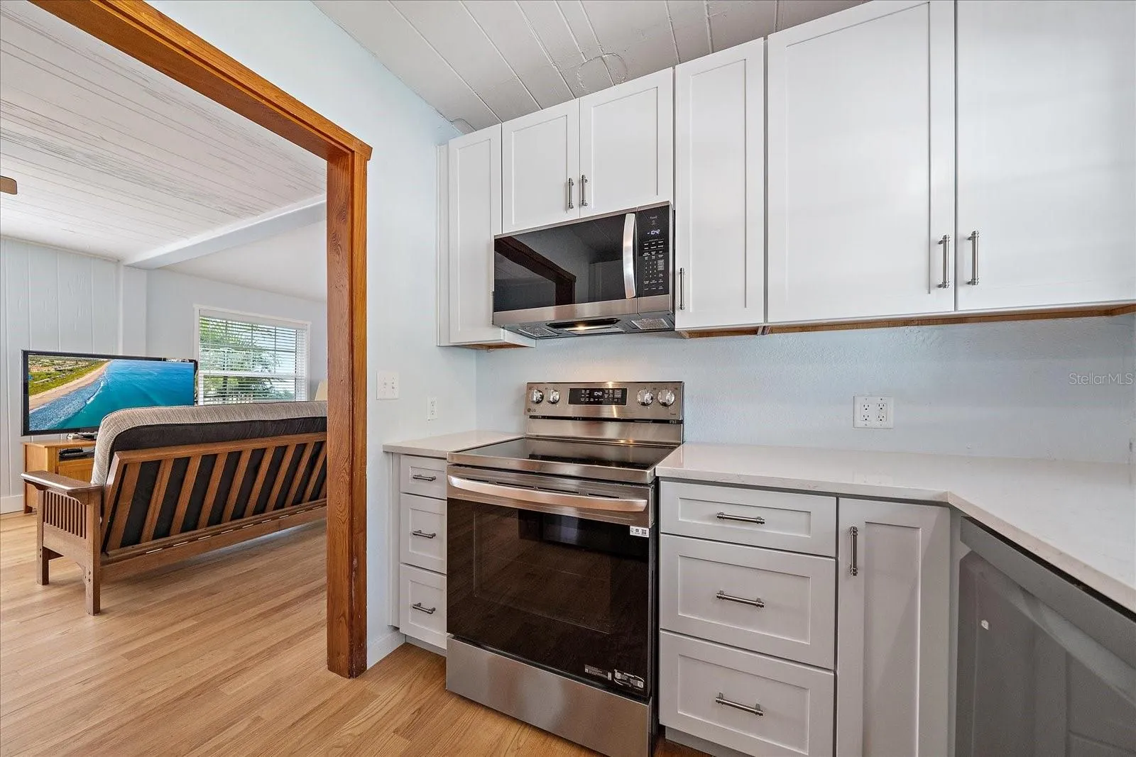 The updated half-galley kitchen features shaker wood cabinetry, soft-close drawers, light quartz countertops, an LG stainless steel appliance package, deep stainless sink, pull-outs, and lazy Susan, all overlooking the front stoop and lawn.