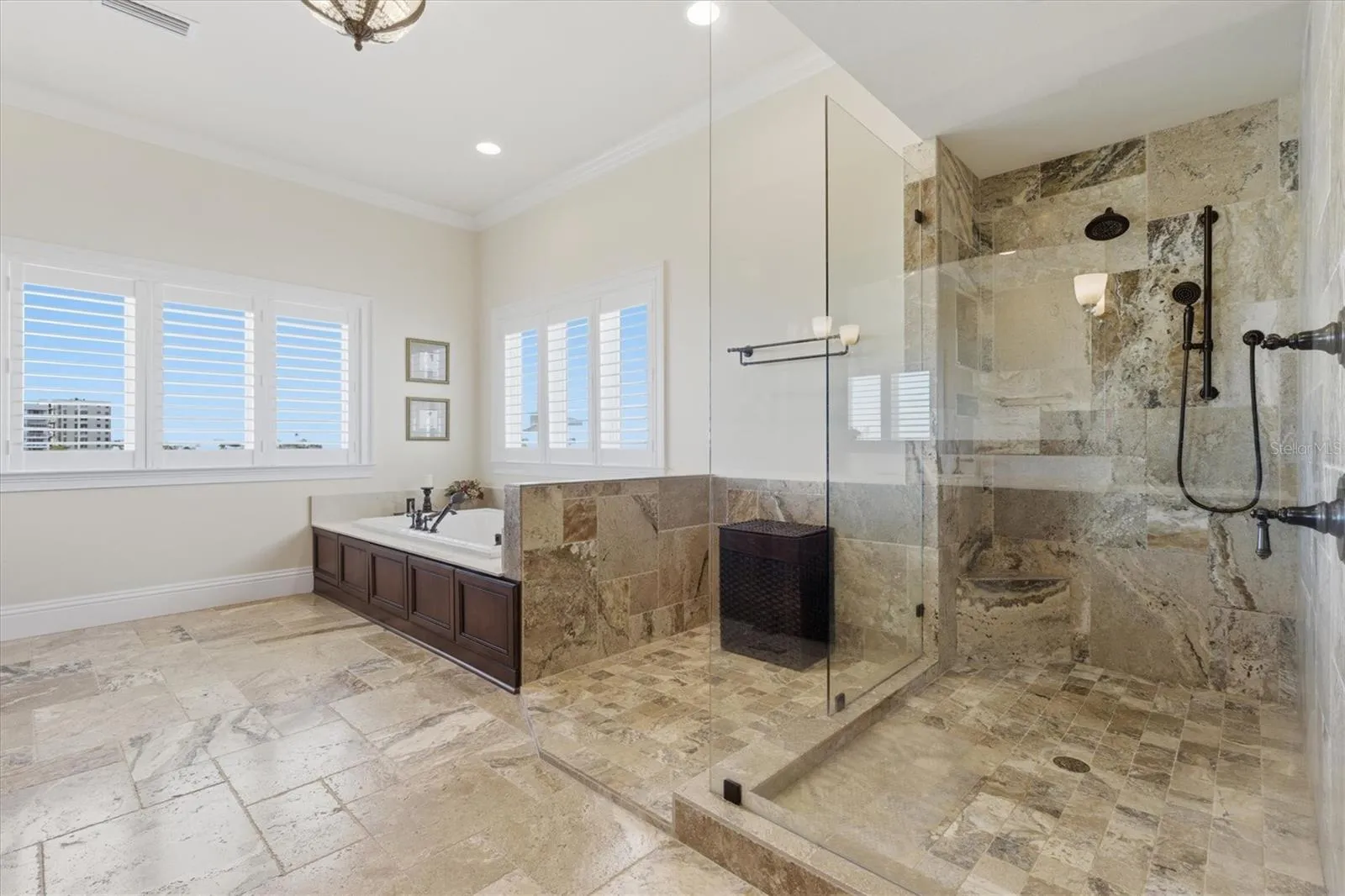The primary suite occupies the entire third floor, creating a private retreat with truly spectacular water views. This serene space includes an adjacent sitting area/office warmed by a striking double-sided fireplace, ideal for quiet mornings or evenings overlooking the Gulf. The luxurious primary bath is beautifully designed with custom built-in features and panoramic water views, while the exceptionally large, well-organized closet offers abundant space for everything imaginable.
