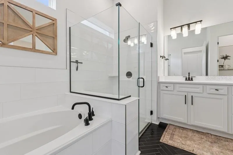 The primary suite is a private sanctuary, offering dual walk-in closets, motorized blackout shades, and a spa-like ensuite bath complete with a soaking tub, frameless glass shower, imported quartz counters, and brand-new herringbone tile floors. Each of the three bedrooms includes an ensuite bath and walk-in closet, ensuring privacy and comfort for all.