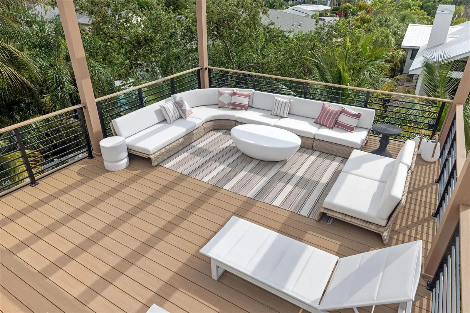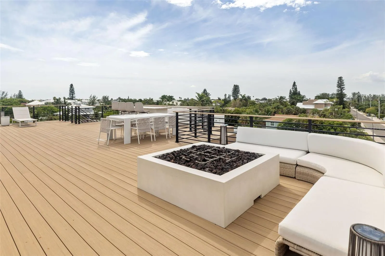 The awe-inspiring design of the indoors flows effortlessly to the 2,500 square feet of outdoor living. Thoughtfully designed, these areas are as breathtaking as the interiors. The palatial rooftop deck spans the entire home, where you can enjoy a game of bocce ball, unwind by the fire pit, or dine alfresco while savoring the breathtaking panoramic water views. Or descend to the sprawling deck below, where a stylish pergola provides a shaded dining area, ideal for gathering with friends. The main level’s expansive backyard features a resort-style pool with built-in bar stools and an in-ground spa for the ultimate relaxation experience. Practice your putt, play a game of ping pong, or retreat to the covered patio’s plush seating and elegant dining area—another perfect spot to gather with loved ones.