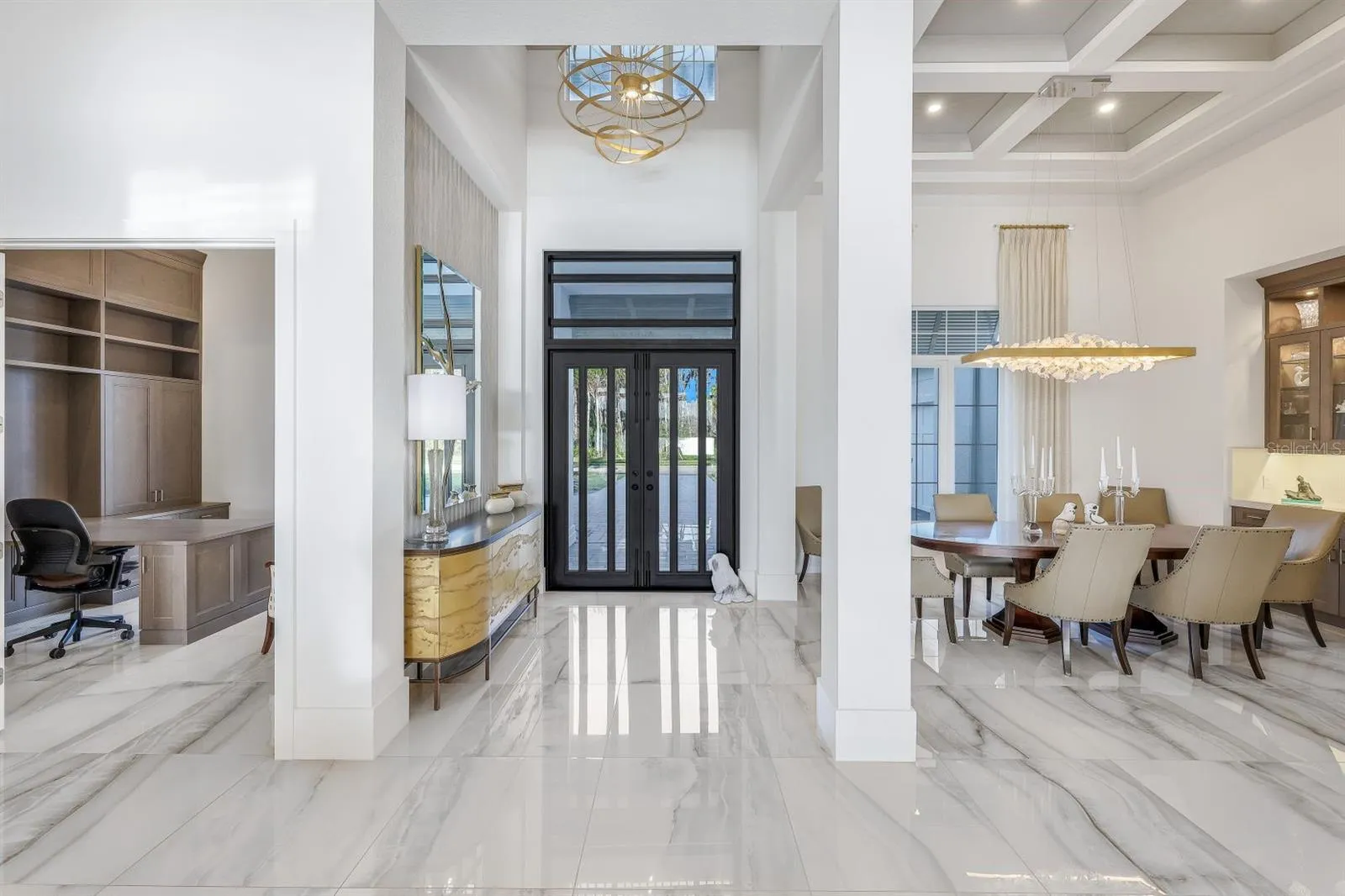 The home features Italian porcelain and wood flooring throughout, custom designer chandeliers and lighting, 9 inch baseboards with outlets, two tankless hot water heaters, an oversized laundry room, a 65 kw Kohler generator and a spacious 4-car garage. Control4 Smart Home technology seamlessly integrates lighting, climate, security, and entertainment throughout the home and lanai.