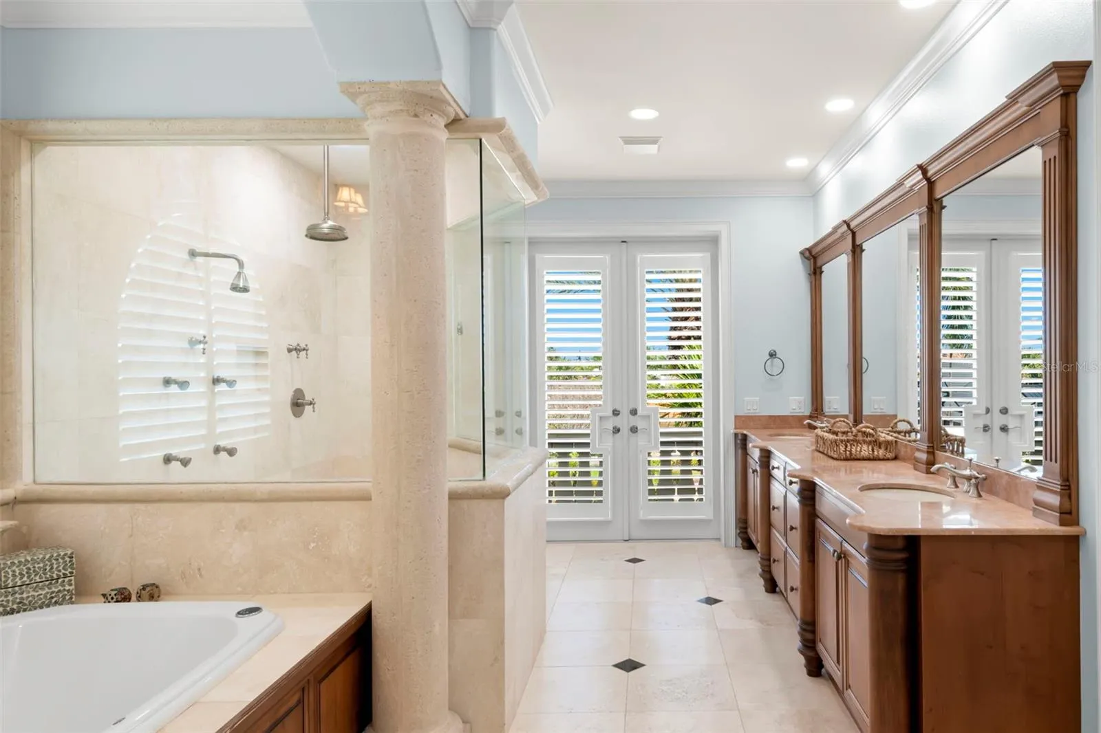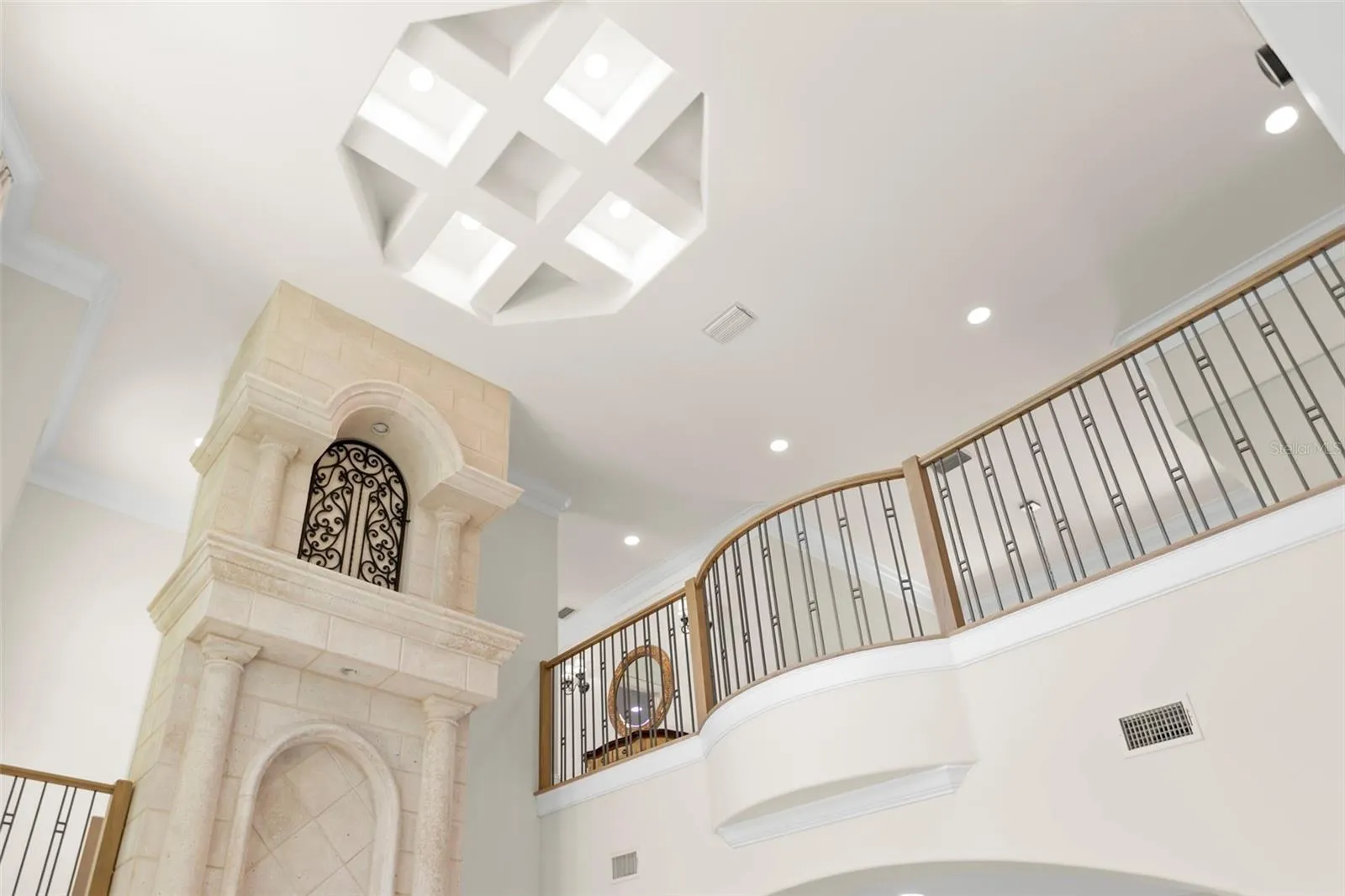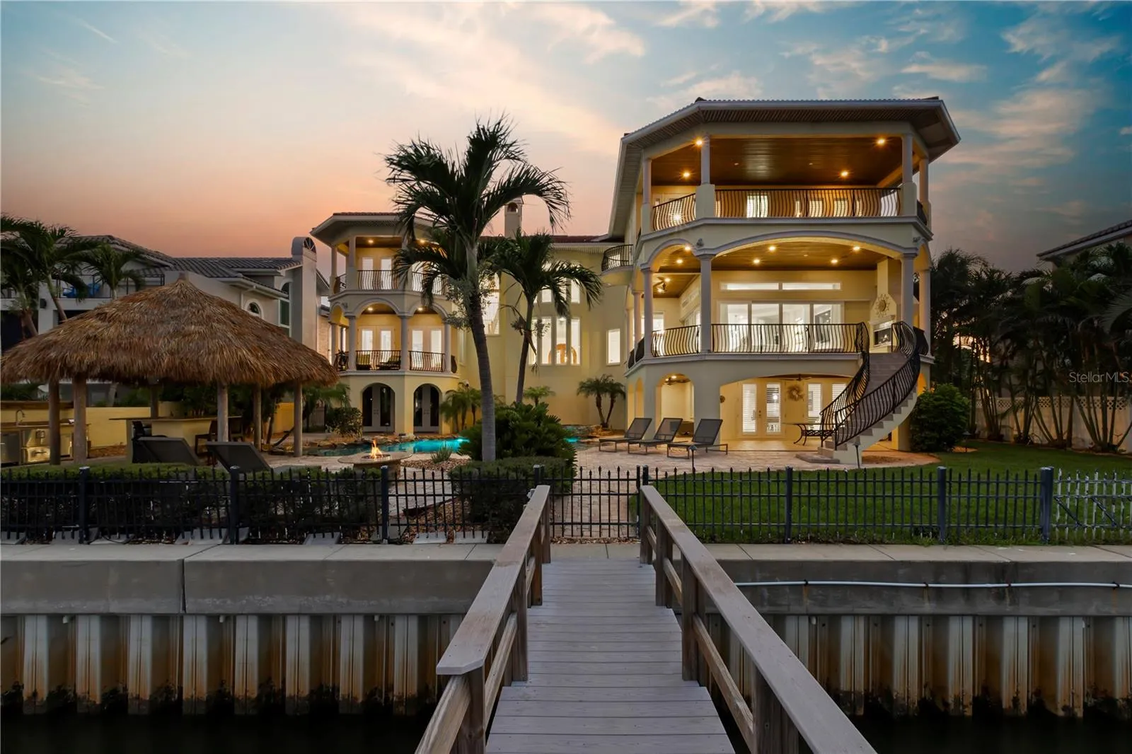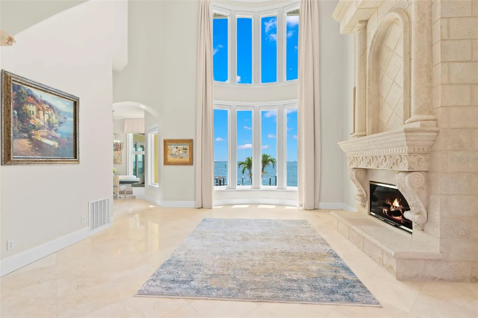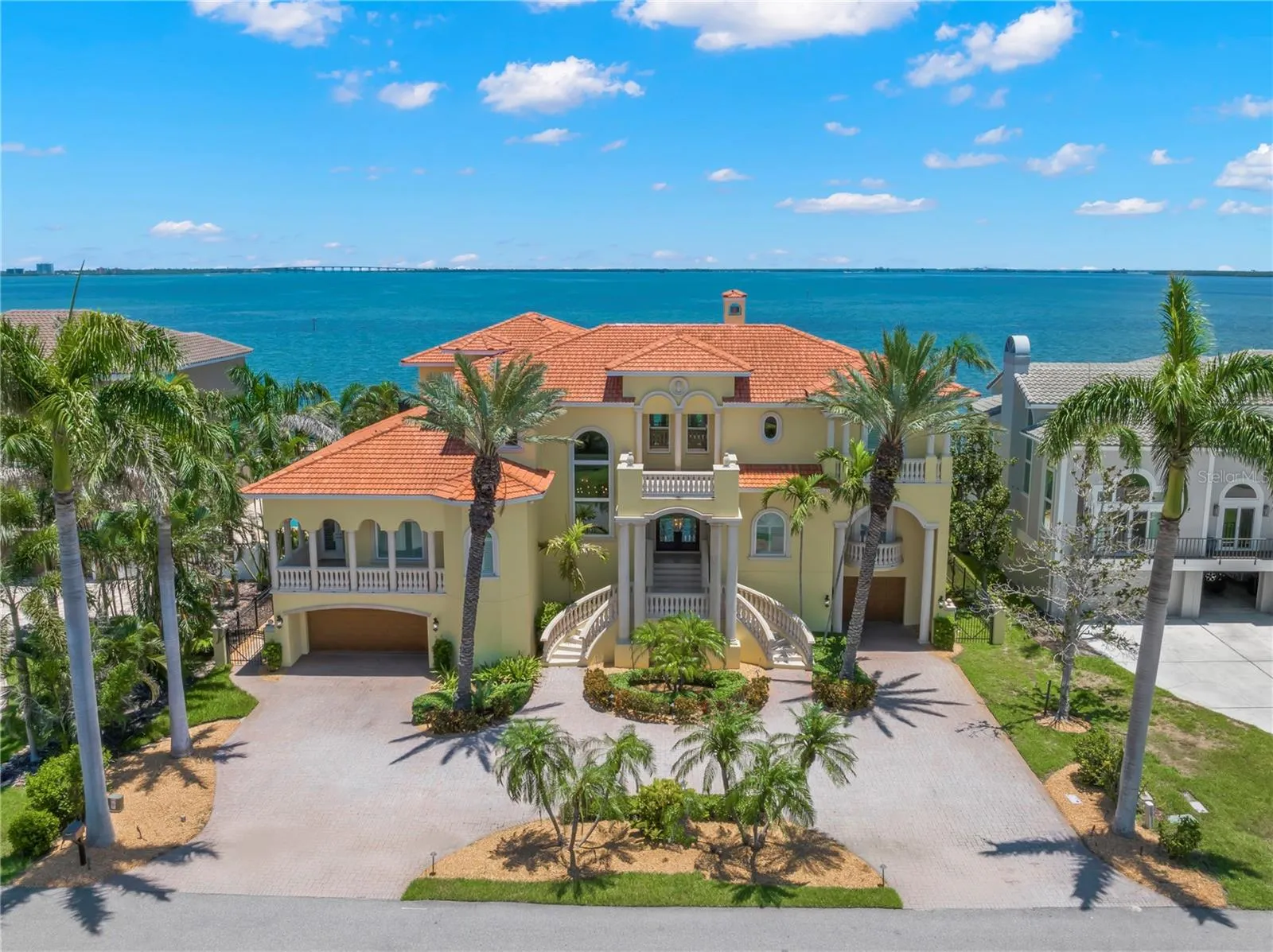 Welcome to an unparalleled sanctuary of luxury and elegance, positioned majestically on Florida’s Tampa Bay. This commanding estate offers an awe-inspiring tableau of open water views that captivate you the moment you step through the grand double glass and wrought iron doors. As you enter the magnificent formal living area, you’re greeted by soaring cathedral ceilings and an inviting cast stone gas fireplace, creating an ambiance that is both impressive and warmly welcoming. Spanning an expansive 7,042 square feet, this palatial abode has been meticulously designed to balance grandeur with the comfort of a home. Recently remodeled to bring the coastal beauty indoors, the home marries elegance with modern coastal aesthetics. Nearly every room is a canvas for breathtaking views, including the brand new designer kitchen. This culinary haven features pristine coastal white cabinetry paired with a contrasting large center island and a breakfast bar, all topped with stunning quartzite stone countertops. Culinary artistry is found in its fabulous blue enamel stove with gas cooktop, complemented by top-of-the-line appliances including dual built-in Thermador refrigerators, two double drawer dishwashers, an ice maker, and a hidden butler’s pantry with additional wine refrigeration. The picturesque family room is a masterpiece of design, offering panoramic views of Tampa Bay through two walls of pocket (hurricane rated) sliding doors that seamlessly blend indoor and outdoor living. Custom crafted shelving and a wide screen complete this space, perfect for relaxation and entertainment. Each of the four generously sized bedrooms features walk-in closets and en-suite baths, providing private retreats for family and guests alike. The main living level hosts a guest suite, a richly paneled office, and a second spacious family room with a bar, adorned with exquisite wall coverings and a large flat-screen TV, creating the ideal setting for movie nights or watching the big game. Completing this level are a formal dining room, a casual dining nook with custom seating, a half bath, and an expansive laundry room. Ascend to the top floor, where the lavish primary suite awaits, featuring a luxurious en-suite bath and two massive walk-in closets equipped with custom closet systems. The opposite wing presents a cozy separate living area for two additional beautiful waterfront bedrooms, each adorned with coastal wall coverings. This estate is as practical as it is beautiful, featuring an exquisite elevator with glass panels for seamless access across all levels, all-new hurricane rated windows and doors, and expansive waterfront decks adorned with designer lighting and architectural mastery. Car enthusiasts will revel in the massive garage on the first level, providing ample space for a fleet of vehicles. The outdoor oasis is a true spectacle, featuring a lagoon-style pool with jacuzzi, a cozy grotto with waterfall, and easy beach entry. The backyard is an entertainer’s dream with an enormous tiki bar and a stainless steel outdoor kitchen. With 100 feet of pristine waterfront, a large dock with wet slip ideal for a yacht, a tide slide system, and boat and jet ski lifts, this estate is not just a home, but a lifestyle to be cherished for a lifetime. Experience unparalleled luxury in Florida’s coastal paradise, where every detail has been crafted to create a home that is both a sanctuary and a statement.