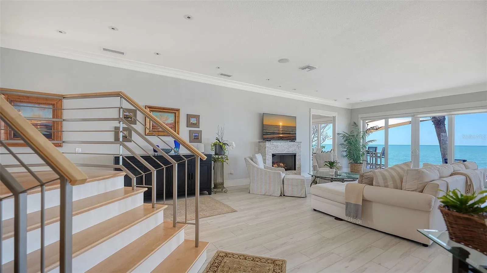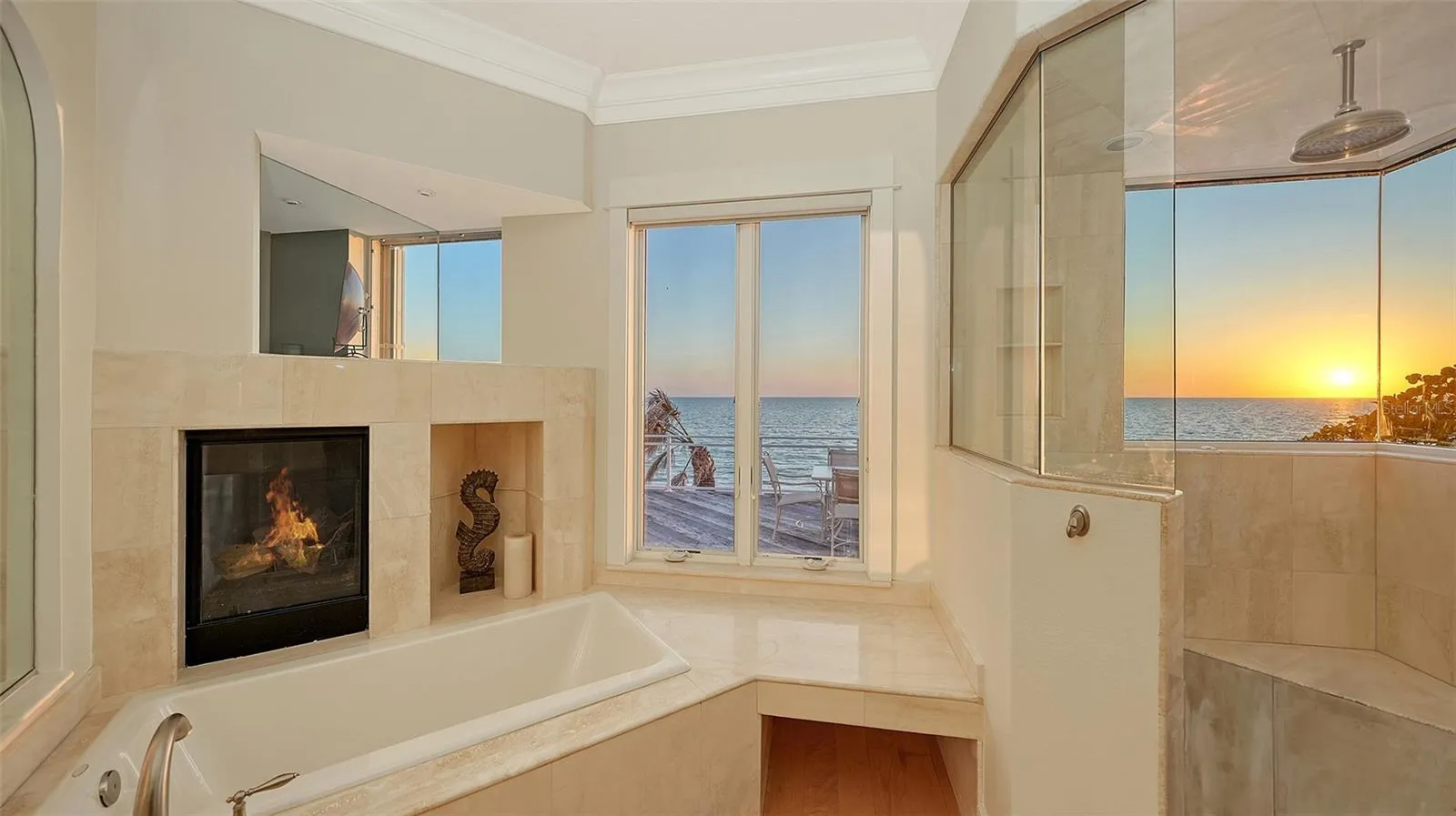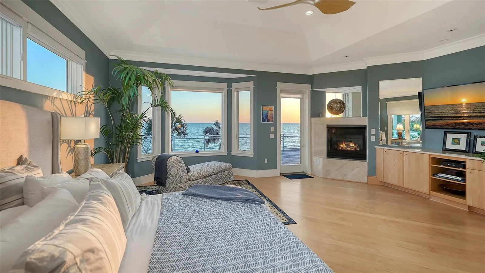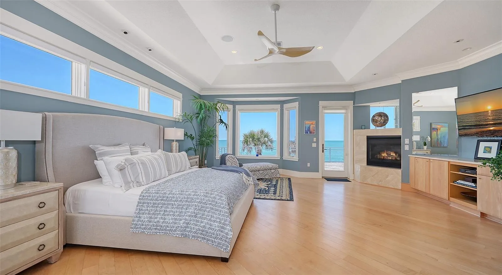 The home’s thoughtful layout provides separation and privacy for family and guests. Two ensuite bedrooms on the ground floor are positioned in their own wings, while a flexible third ensuite—currently used as a den—can easily become a fourth bedroom, also having a large storage closet and beautiful Gulf views. Upstairs, the spacious master suite is a peaceful retreat with stunning beach and bay views, with a two-sided fireplace, sitting area, spa-like bath, and a private Brazilian walnut wood deck overlooking the Gulf. A second covered balcony on the bay side and a refined office with custom built-ins round out the upper level.
